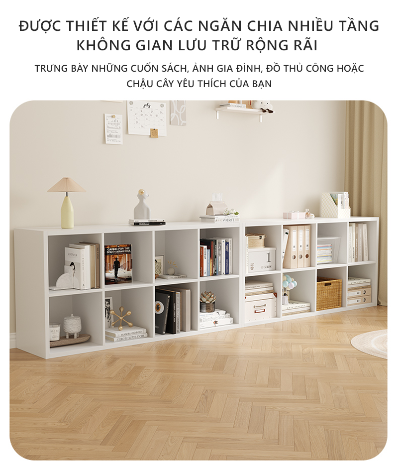 Công năng: Là mẫu kệ sách đa năng theo phong cách minimalism giúp bạn decor phòng cực xinh và hiệu quả