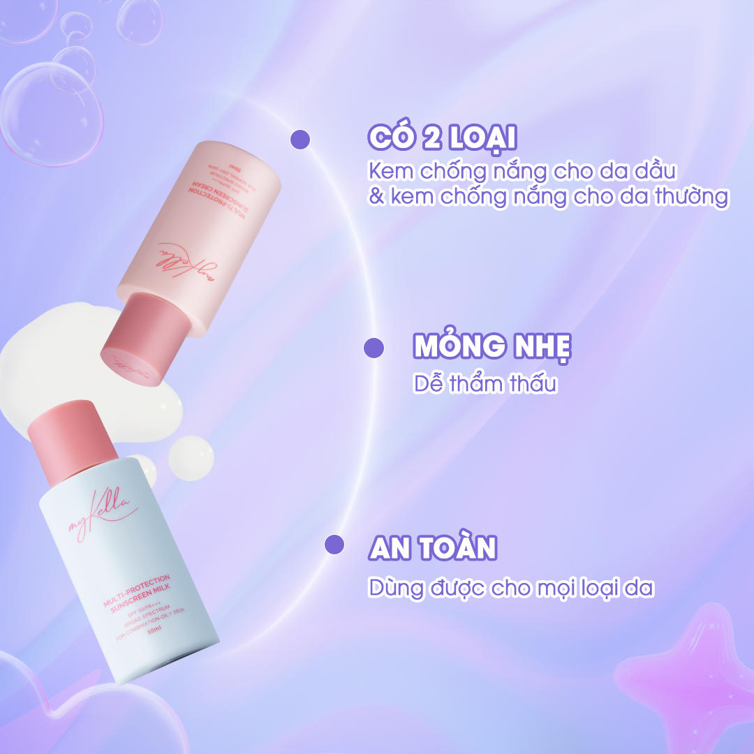 - Kem chống nắng myKella Multi Protection Sunscreen Milk là sản phẩm không thể thiếu trong quy trình chăm sóc da hàng ngày, giúp bảo vệ da khỏi tác hại của tia UV và môi trường, đồng thời cung cấp độ ẩm và dưỡng chất cần thiết cho làn da khỏe mạnh.