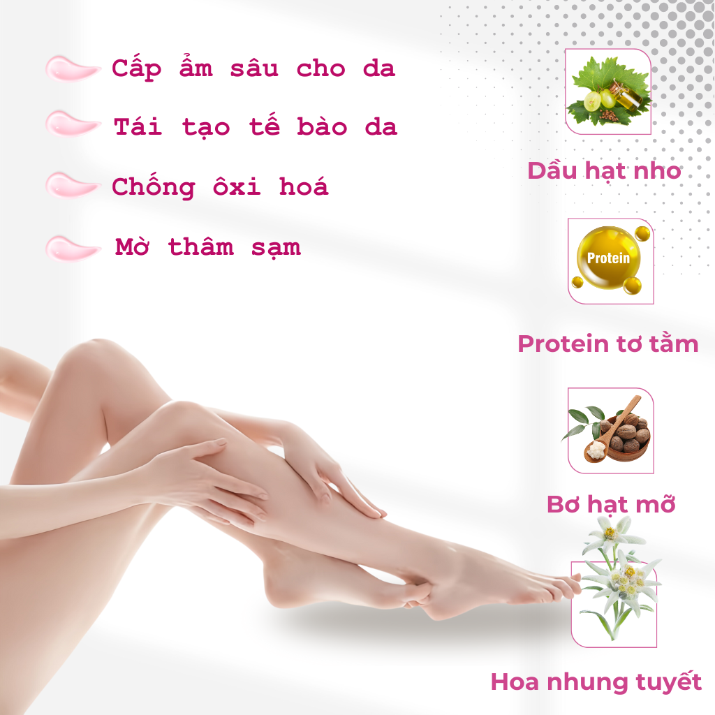 Mua tại TiktokKem Dưỡng Thể Trắng Da Nâng Tone Tăng Cường POP Sử dụng sữa dưỡng thể trắng da mỗi ngày là phương pháp đang được rất nhiều bạn trẻ lựa chọn để có được làn da trắng sáng, khoẻ mạnh. Kem dưỡng thể trắng da nâng tone POP chứa các hoạt chất dưỡng trắng tăng cường niacinamide 5% và alpha-arbutin 0.3% cùng với thành phần thiên nhiên chiết xuất từ dầu hạt nho, hoa nhung tuyết, protein tơ tằm, … mang đến cho bạn giải pháp dưỡng da chuyên sâu, hoàn hảo: Dưỡng trắng da tự nhiên, làm mờ các vết thâm sạm: chứa các thành phần hoạt tính tăng cường và dưỡng chất từ thiên nhiên chọn lọc giúp làm giảm sắc tố melanin trên da, ngăn ngừa sự hình thành của vết thâm do cháy nắng để lại, chống lại những vết thâm sạm, đốm đen giúp cho làn da của bạn được trắng sáng, mịn màng hơn. Giúp tái tạo làn da: hỗ trợ tẩy tế bào chết trên da, loại bỏ được những vùng da khô cứng và hấp thụ dưỡng chất một cách dễ dàng, giúp thúc đẩy khả năng tái tạo tế bào da mới để làn da của bạn luôn được căng bóng, mịn màng và tràn đầy sức sống. Cân bằng độ ẩm cho da: cung cấp độ ẩm cần thiết cho làn da của bạn, duy trì và cân bằng độ ẩm từ sâu bên trong giúp làn da của bạn luôn được mịn màng và không bị khô sần. Tăng cường độ đàn hồi: chứa các vitamin và chất chống oxy hóa giúp ngăn ngừa tình trạng lão hóa. Ngoài ra, còn giúp da tái tạo collagen nhằm tăng cường độ đàn hồi và săn chắc cho làn da. Nâng tone nhanh, hiệu quả dưỡng trắng nổi bật: công thức chuyên sâu của POP với các thành phần dưỡng trắng da tăng cường giúp làn da của bạn trắng sáng tự nhiên và bật tone ngay sau lần đầu sử dụng. Thành phần chính: Niacinamide: Có tác dụng làm sáng và đều màu da, giúp da trở nên rạng rỡ và tươi trẻ, làm giảm sự sản sinh melanin, làm mờ các vết thâm, nám và tàn nhang. Đặc biệt là Niacinamide còn có khả năng kích thích quá trình tái tạo tế bào da, loại bỏ các tế bào chết và sừng hóa, giúp da trở nên sáng khỏe và đều màu. Niacinamide có tác dụng đẩy nhanh quá trình phục hồi da bị tổn thương bởi ánh nắng mặt trời, cải thiện cấu trúc da, chống lão hoá da hiệu quả, duy trì độ ẩm cho da và củng cố lại hàng rào bảo vệ da bảo vệ làn da khỏi xâm nhập xấu từ môi trường bên ngoài. Niacinamide còn hoạt động tăng cường độ ẩm giữ nước cho làn da, hỗ trợ giảm tiết dầu thừa. Với tính kháng khuẩn cao niacinamide làm giảm sưng tấy do mụn gây ra, hạn chế mụn trứng cá, hỗ trợ giúp cho làn da luôn khỏe mạnh, mịn màng. Alpha-Arbutin: Ức chế enzyme sản sinh ra melanin (hắc sắc tố), làm giảm tình trạng sạm, nám, tàn nhang và quá trình lão hóa của da, giúp làn da của bạn được căng mịn, trắng sáng và tươi trẻ hơn. Bơ hạt mỡ : Thành phần bao gồm các chất béo không bão hòa với một tỷ lệ lớn, các axit béo thiết yếu, phytosterol, vitamin E và D, vitamin A và allantoin, một siêu thực phẩm cho làn da. Ngăn ngừa và hình thành nếp nhăn và chữa lành làm mờ vết sẹo. Chống lão hóa nhờ thành phần chất chống oxy hóa. Giúp da giữ ẩm sâu. Tăng khả năng dẻo dai của da. Dầu hạt nho: Có khả năng làm sạch và se khít các lỗ chân lông, loại bỏ độc tố và chất nhờn trong nang lông, củng cố màng tế bào và tăng cường độ đàn hồi của da, nhờ đó giúp giảm nhanh mụn và phục hồi tổn thương, thâm mụn lâu ngày. Dầu hạt nho có đặc tính chống oxy hóa mạnh. mang lại khả năng bảo vệ da khỏi các tác nhân gây hại từ môi trường. Ngoài ra, dầu hạt nho còn có khả năng cải thiện sắc tố da, giúp da được đều màu, mềm mịn và săn chắc hơn. Sericin (Protein tơ tằm): Là một loại protein do bombyx mori (tằm dâu) tạo ra trong quá trình sản xuất tơ. Sericin được chứng minh có thể cải thiện độ đàn hồi của da và chống nếp nhăn. Điều này được thực hiện bằng cách giảm thiểu sự mất nước từ da. Chiết xuất hoa nhung tuyết: Đây là thành phần rất giàu chất chống oxy hóa, giúp bảo vệ da khỏi tác hại của các gốc tự do và ngăn ngừa lão hóa sớm, giúp giữ ẩm và làm dịu làn da khô bị kích thích và nhạy cảm. Cùng với đó, các hoạt chất có trong hoa tuyết nhung còn có khả năng hạn chế sự xuất hiện của các vết đốm đen, thâm sạm và chứng tăng sắc tố da, giúp da được trắng sáng hơn. Ngoài ra, chiết xuất hoa nhung tuyết còn có đặc tính chống tia cực tím tự nhiên và có thể giúp bảo vệ da khỏi những tác hại của ánh nắng mặt trời. Thành phần đầy đủ: Aqua, Glycerin, Niacinamide, Paraffinum Liquidum, Caprylic/Capric Triglyceride, Titanium Dioxide, Dimethicone, Polyacrylamide, Butyrospermum Parkii Butter, Alpha-Arbutin, Vitis Vinifera Seed Oil, Sericin, Leontopodium Alpinum Extract, Menthol, C13-14 Isoparaffin, C9-11 Pareth-6, Polyacrylate Crosspolymer-11, Hydrogen Dimethicone, Benzophenone-5, Disodium EDTA, Citric Acid, Ethylhexylglycerin, Phenoxyethanol, Potassium Sorbate, Sodium Benzoate, Parfum, Aluminum Hydroxide, CI 15985. Sản phẩm được sản xuất tạ
