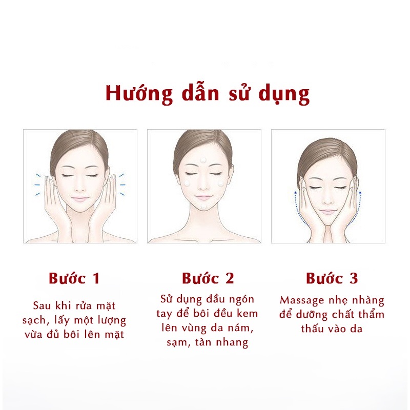 - Hướng dẫn sử dụng: Làm sạch da mặt bằng sửa rửa mặt hoặc nước ấm, lau khô, lấy một lượng kem vừa đủ chấm vùng da thâm và mụn. Massage nhẹ nhàng cho đều để hoạt chất thẩm thấu vào da. Ngày sử dụng 2 lần sáng và tối. 99% hiệu quả cảm nhận sau 5 ngày sử dụng với làn da trắng hồng tự nhiên.