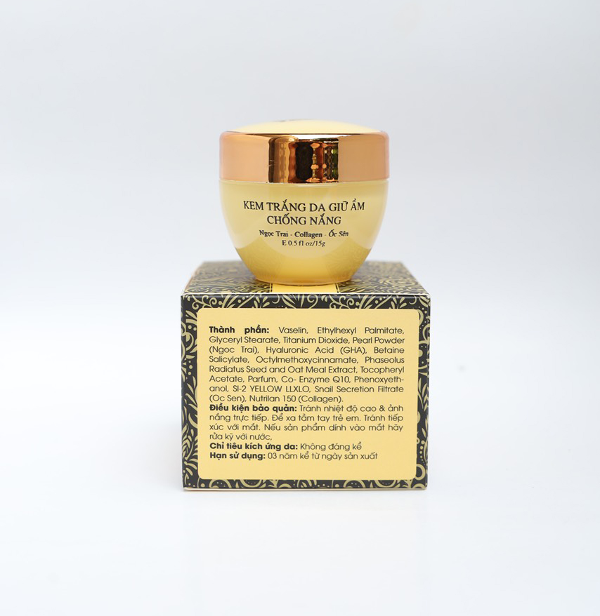 Sản phẩm là sự kết hợp hoàn toàn từ các tinh chất Ngọc trai, collagen và ốc sên có tác dụng làm mờ vết nám, sạm, tàn nhang, và các sắc tố có hại cho