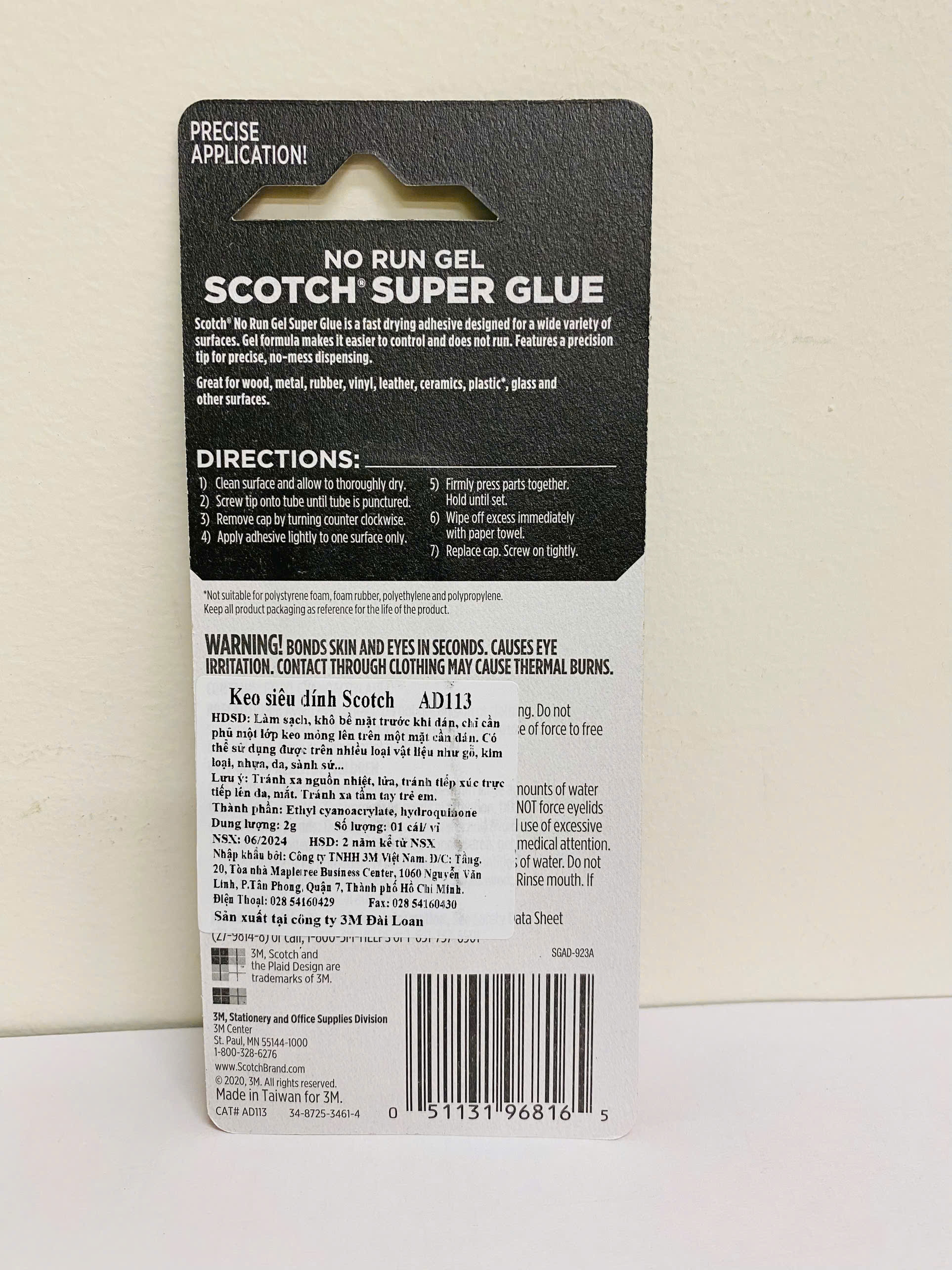 Mua tại TiktokKeo dán đa năng siêu dính Scotch 3M AD113 *Thông số kỹ thuật: Thương hiệu: 3M Xuất xứ thương hiệu: Mỹ Sản xuất tại: Đài Loan Mã sản phẩm: AD113 Quy cách: 2g/tuýp, 12 tuýp/hộp Màu sắc:trong suốt Chất liệu: Ethyl cyanoacrylate, hydroquinone