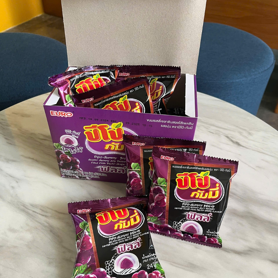Kẹo dẻo Pipo Gummy vị nho - món kẹo ăn vặt siêu ngon dành cho các bạn - Với sự kết hợp bên ngoài mềm dẻo, bên trong đẫm nhân nho tạo cảm giác thơm