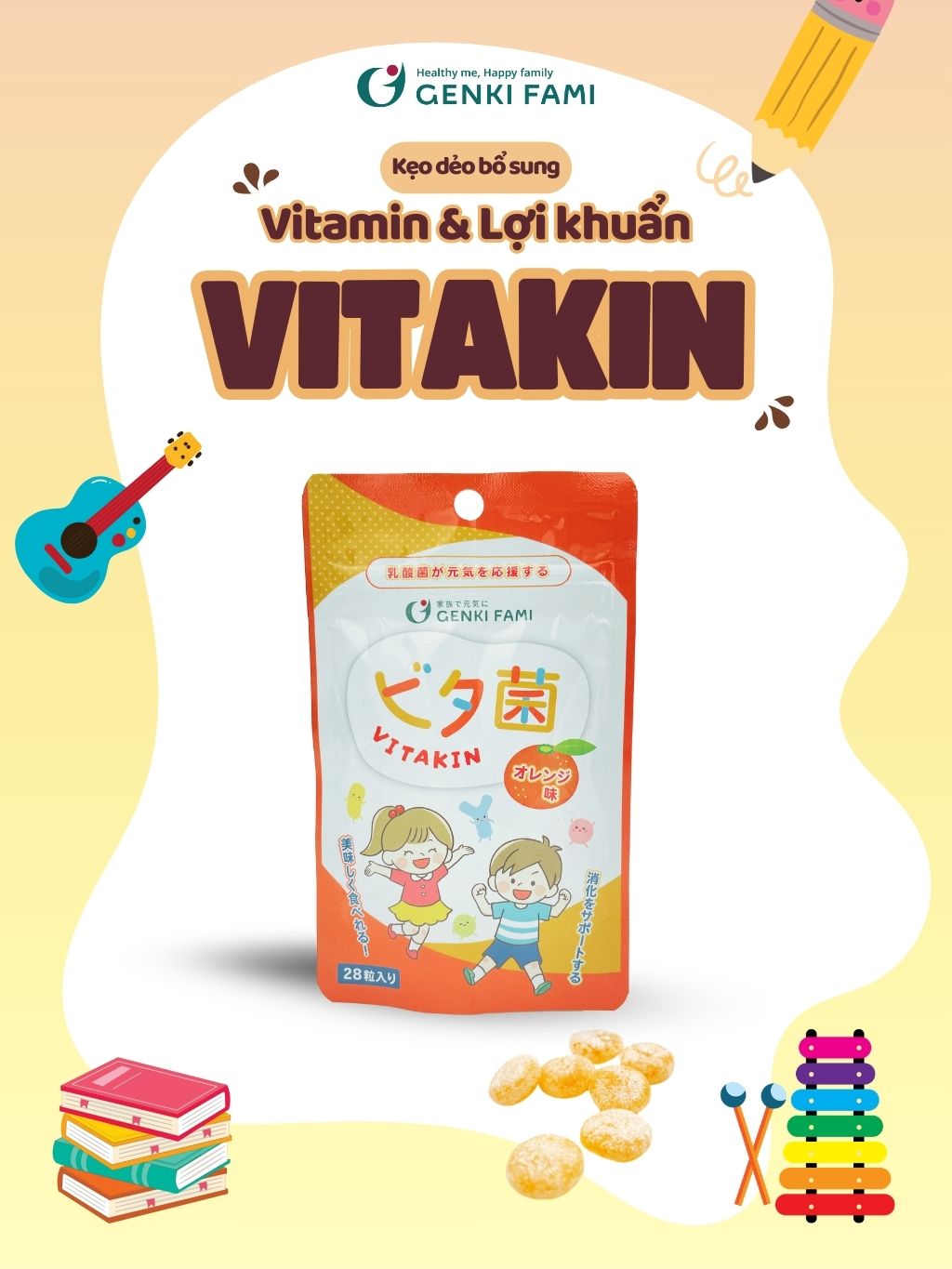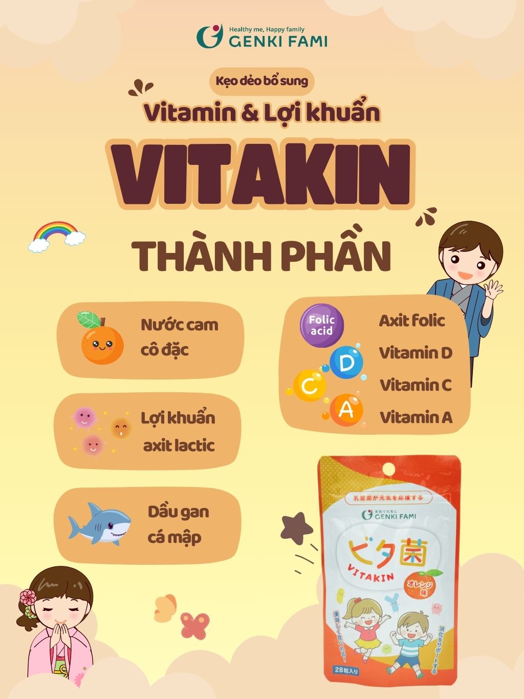 THÀNH PHẦN: Đường cát, siro tinh bột, bột màng oblate, nước cam cô đặc, lợi khuẩn axit lactic ( 1 tỷ lợi khuẩn), dầu gan cá mập tinh chế (11.33 mg), vitamin C (