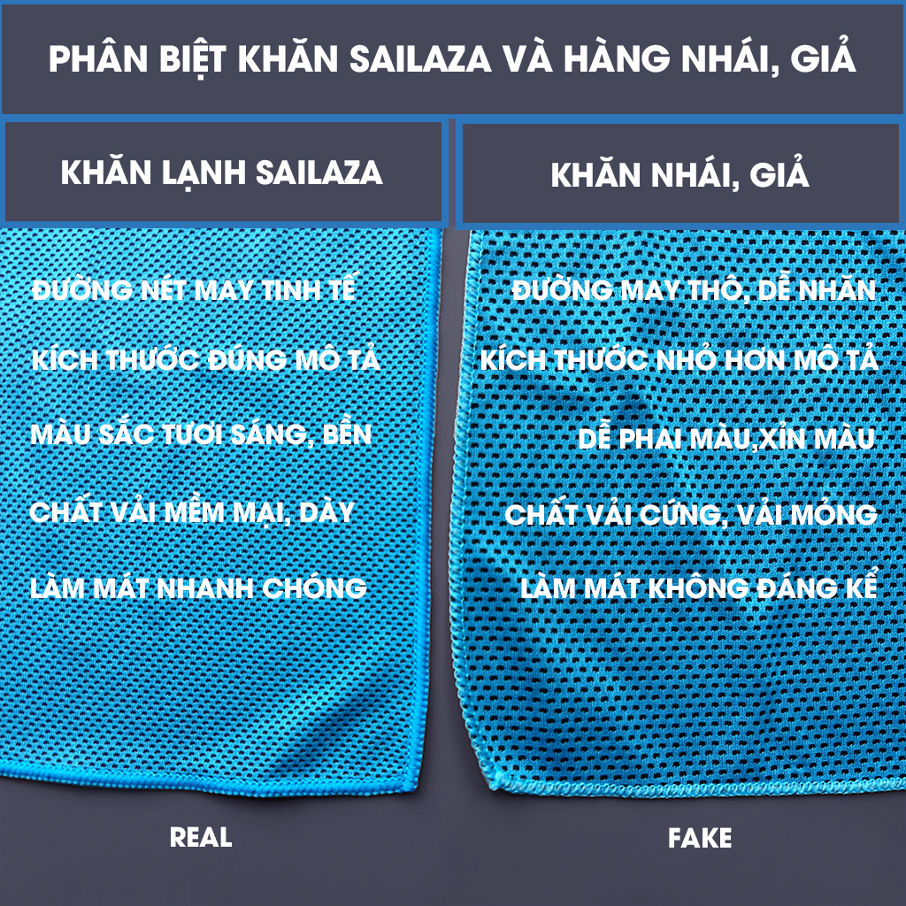 Thành phần vải mềm: 55% yếu tố bánh xe cotton. Cảm ứng tinh tế và thoải mái. Hướng dẫn sử dụng khăn làm mát Sailaza: B1: Nhúng khăn vào trong nước B2: Vắt khăn thật kỹ B3: Vẩy (rũ) khăn mạnh tầm 3-5 lần Khăn sẽ hạ nhiệt nhanh chóng để sử dụng làm mát cơ thể tức thì