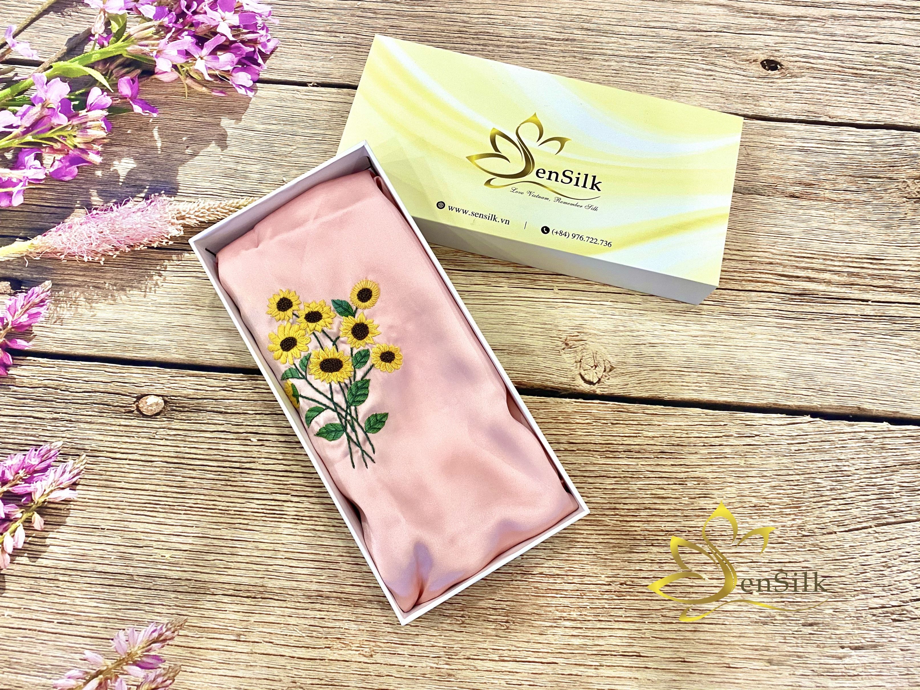 Khăn Lụa Thêu Hoa Hướng Dương SenSilk loài hoa tình yêu luôn hướng về phía mặt trời nên thường là biểu tượng của lòng trung thành, chung thủy sâu sắc, sự kiên định đó cũng biểu thị cho sức mạnh, uy quyền, sự ấm áp…
