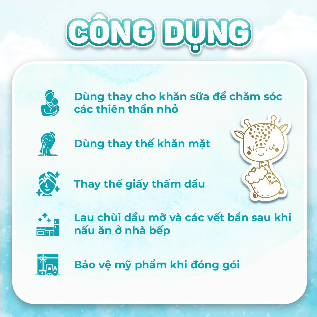 MÔ TẢ SẢN PHẨM: ️Sản xuất tại: Việt Nam. ️Mùi hương: không mùi ️Kích thước: 150 x 180 mm ️Quy cách đóng gói: 1 túi 270 tờ ️Ngày sản xuất: Xem trên bao bì ️Hạn sử dụng: 5 năm kể từ ngày sản xuất.   CÔNG DỤNG: ️An toàn sử dụng cho em bé: lau mặt, lau miệng khi bé ăn, lau tay chân, lau khi thay tã hoặc tắm cho bé,... ️Thay thế cho khăn mặt hàng ngày, thấm khô mặt sau khi rửa hoặc thay thế khăn ăn, khăn vải truyền thống. ️Sử dụng làm bông tẩy trang, đắp toner. ️Phù hợp vệ sinh cho khu vực bếp và các vật dụng trong gia đình.   ƯU ĐIỂM: ️Thành phần không chứa chất huỳnh quang và các hóa chất độc hại nên rất an toàn cho trẻ sơ sinh. ️Các sợi bông được chọn lọc kỹ lưỡng và kiểm tra định kỳ bởi đội ngũ kĩ sư, mang đến cảm giác siêu mềm mại, siêu thấm hút, an toàn cho làn da nhạy cảm. ️Túi zip với khóa kéo chắc chắn giúp bảo vệ tốt chất lượng sản phẩm.