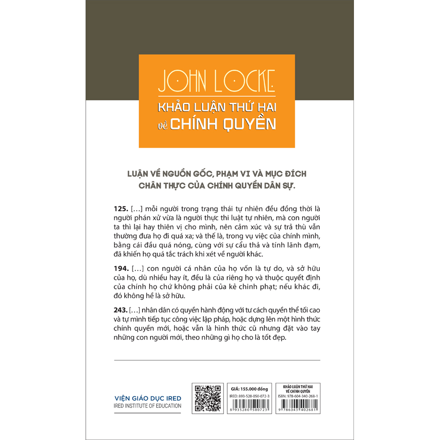Đây là một tác phẩm kinh điển, được John Locke luận chứng và lý giải về quyền lực của nhân dân đối với sự tồn tại của chính quyền, xuất bản năm 1689, có tên Khảo luận thứ hai về chính quyền.