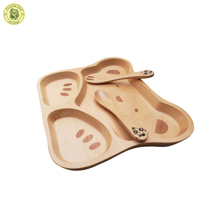 Sản phẩm đã được đóng gói bằng OPP, bên trong khay gồm muỗng và nĩa gỗ nhỏ cho bé. Họa tiết trên khay đơn giản, được chạm khắc trên khay - không dùng sơn để vẽ.