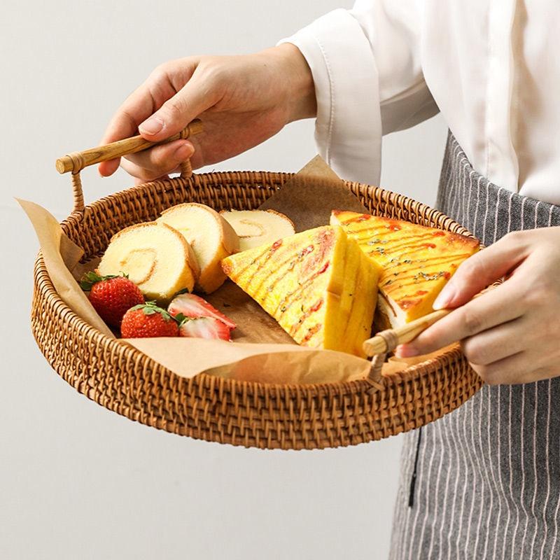 Khay Tròn Decor ECOHUB Bằng Mây Đựng Đồ Ăn, Trà Bánh Hoa Quả, Gia Vị Nhà Bếp Có Quai Gỗ 2 size