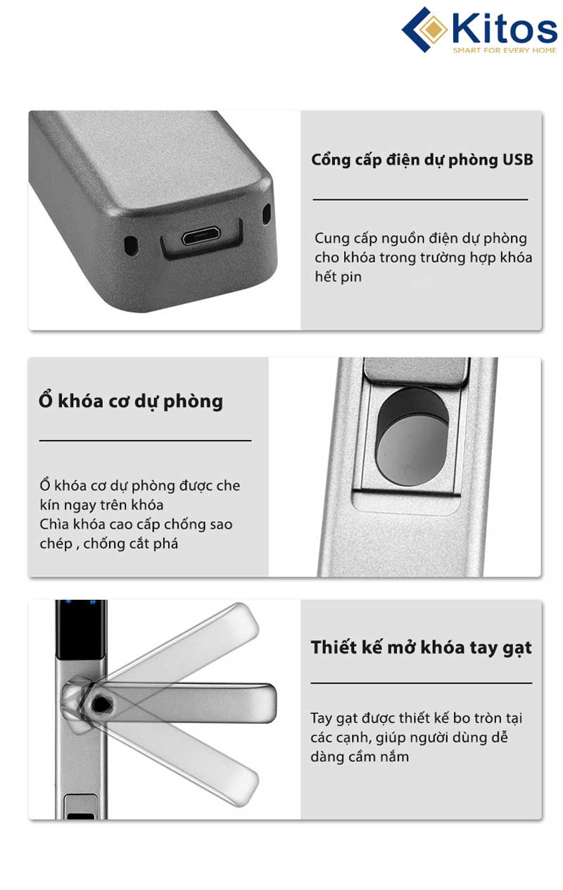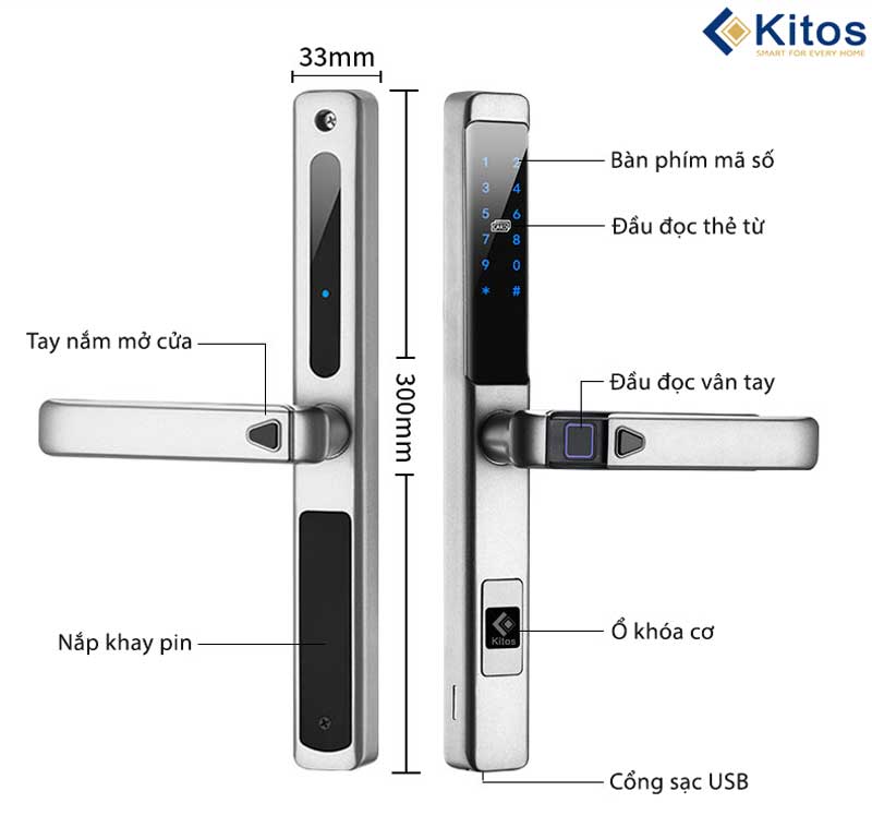Khóa vân tay cửa nhôm Kitos KT-AL650 là mẫu khóa mới ra mắt thị trường của thương hiệu Kitos – Nhật Bản với nhiều nâng cấp công nghệ, chất lượng sản phẩm so với các thế hệ khóa trước đó. Điều đặc biệt đầu tiên gây ấn tượng đó là mẫu khóa cửa nhôm với khả năng chống nước cực tốt đạt tiêu chuẩn IP67. Với nhu cầu lắp đặt cho cửa ngoài trời ngày một cao, chịu ảnh hưởng rất nhiều bởi mưa gió, bụi, thời tiết xấu,… nên việc được trang bị công nghệ chống nước, chống bụi bẩn IP67 là hoàn toàn cần thiết đối với bất cứ bộ khóa nào. Bộ khóa vân tay cửa nhôm Kitos AL650 bên cạnh việc được trang bị công nghệ chống nước còn được thiết kế phần đầu đọc vân tay vô cùng đặc biệt và tinh tế. Trên tay nắm của Kitos AL650 được thiết kế một nắp trượt để che đi vị trí đặt vân tay. Điều này giúp bảo vệ cho đầu đọc vân tay không bị tác động bởi các yếu tố ngoại quan như mưa gió, bụi,… Đồng thời, ngay cả khi thời tiết mưa ẩm, vân tay vẫn luôn được đảm bảo khô ráo giúp tăng tốc độ nhận diện của bộ khóa. Đặc điểm nổi bật khóa cửa vân tay Kitos KT-AL650 Cũng giống như các thế hệ khóa vân tay cửa nhôm trước đó, Kitos vẫn trang bị cho AL650 đa dạng tính năng mở khóa bao gồm: vân tay, thẻ từ, mã số và một ổ khóa cơ dự phòng trong các trường hợp khẩn cấp. Công nghệ vân tay đa điểm 360 – công nghệ tiên tiến bậc nhất mang lại tên tuổi cho thương hiệu Kitos suốt nhiều năm qua cũng được sử dụng trên Kitos AL650. Công nghệ vân tay đa điểm 360 trên Kitos KT-AL650 hỗ trợ người dùng sử dụng vân tay để mở khóa với tốc độ nhanh nhất chỉ từ <0,5s và độ chính xác gần như tuyệt đối. Bạn có thể đặt vân tay theo nhiều hướng khác nhau thì đầu đọc vân tay vẫn có thể nhận diện được. Đặc biệt, công nghệ vân tay đa điểm 360 còn hỗ trợ người dùng sử dụng vân tay để mở khóa ngay cả khi dấu vân tay bị ướt hay bị mờ ở người cao tuổi, vân tay chưa hình thành rõ ràng ở trẻ em,… Điều đó cho thấy, bộ khóa vân tay cửa nhôm Kitos AL650 phù hợp sử dụng đối với mọi gia đình, ngay cả gia đình có nhiều thế hệ thành viên. Công nghệ mã số ảo (Fake Code) trên khoá cửa vân tay Kitos AL650 cũng là một trong những công nghệ hiện đại được yêu thích nhất hiện nay. Với sự nhận diện thông minh, khả năng bảo mật, an toàn cao, mang tới cho bạn sự yên tâm khi sử dụng. Bạn có thể đặt mật khẩu mở khóa (6 số) và khi mở có thể thêm vào trước và sau dãy số mật khẩu một dãy số bất kỳ để che đi mật khẩu đúng. Ví dụ: mật khẩu của bạn là 123456, khi bạn mở cửa bạn có thể bấm một dãy số thật dài như “ 051736123456098671” mà khóa vẫn có thể nhận diện được và mở khóa thành công. Mở khóa bằng thẻ từ đã không còn quá xa lạ với bất cứ ai đã từng nghe hoặc từng sử dụng khóa cửa thông minh. Thẻ từ Kitos là dòng thẻ từ RFID có tần số độc nhất, không trùng lặp với bất cứ mẫu thẻ từ nào khác trên thị trường. Đồng thời việc làm giả, sao chép thẻ từ cũng là điều không thể xảy ra. Thiết kế hiện đại – đẹp mắt Bên cạnh những tính năng mở khóa thông minh thì bộ Kitos AL650 cũng được sở hữu những tính năng mở khóa trong trường hợp khẩn cấp. Bộ chìa khóa cơ dự phòng của Kitos AL650 là bộ chìa cơ đặc biệt được thiết kế đặc biệt, không có chìa bổ sung cũng như không thể sao chép hay phá ổ khóa một cách dễ dàng. Trong trường hợp bộ khóa hết pin mà bạn chưa kịp thay nhưng bạn lại không mang theo chìa cơ mở cửa thì bạn cũng không cần quá lo lắng. Bởi nhà sản xuất đã thiết kế thêm một cổng sạc dự phòng USB dự phòng trong các tình huống này. Bạn chỉ cần tìm một nguồn điện như sạc dự phòng và một dây sạc micro USB để kết nối và cấp điện cho bộ khóa. Đợi trong nháy mắt bộ khóa sẽ tiếp nhận năng lượng và có thể hoạt động bình thường. Một điểm đặc biệt nữa được trang bị trên Kitos AL650 đó là công nghệ cảm biến chống phá hoại thông minh. Khi bộ khóa chịu tác động của ngoại lực đủ lớn, nó sẽ phát ra âm thanh cảnh báo cho gia chủ biết đến sự xâm nhập trái phép. Với tính năng này, Kitos AL650 được rất nhiều khách hàng yên tâm sử dụng để lắp đặt cho cửa ngoài trời của nhà mình. Bộ khóa cửa nhôm Kitos AL650 được thiết kế với kích thước nhỏ gọn hơn một chút so với các thế hệ khóa trước đó. Bù lại thì độ cứng cáp, chất liệu thân khóa được nâng cấp mang lại sự chắc chắn, an toàn cao hơn hẳn. Kitos KT-A650 với kích thước nhỏ có thể lắp đặt cho các dòng cửa nhôm hệ xingfa, cửa nhôm kính. cửa gỗ đố nhỏ một cách dễ dàng.