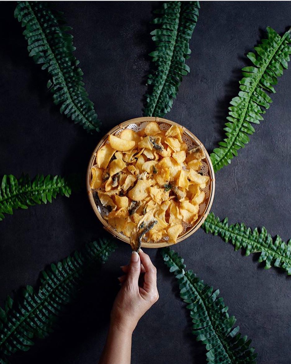 Khoai tây cắt lát mỏng được chiên vàng giòn, trộn với lòng đỏ trứng muối thật thơm, lá cà ri thơm và ớt sừng đỏ rực, cảm giác giòn rụm, cay the và vị trứng