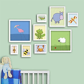 - Bộ khung ảnh bao gồm: 2 khung 25 x 25 cm, 1 khung 20 x 25 cm, 1 khung 15 x 21 cm, 3 khung 13 x 18 cm, 2 khung 10 x 15 cm.