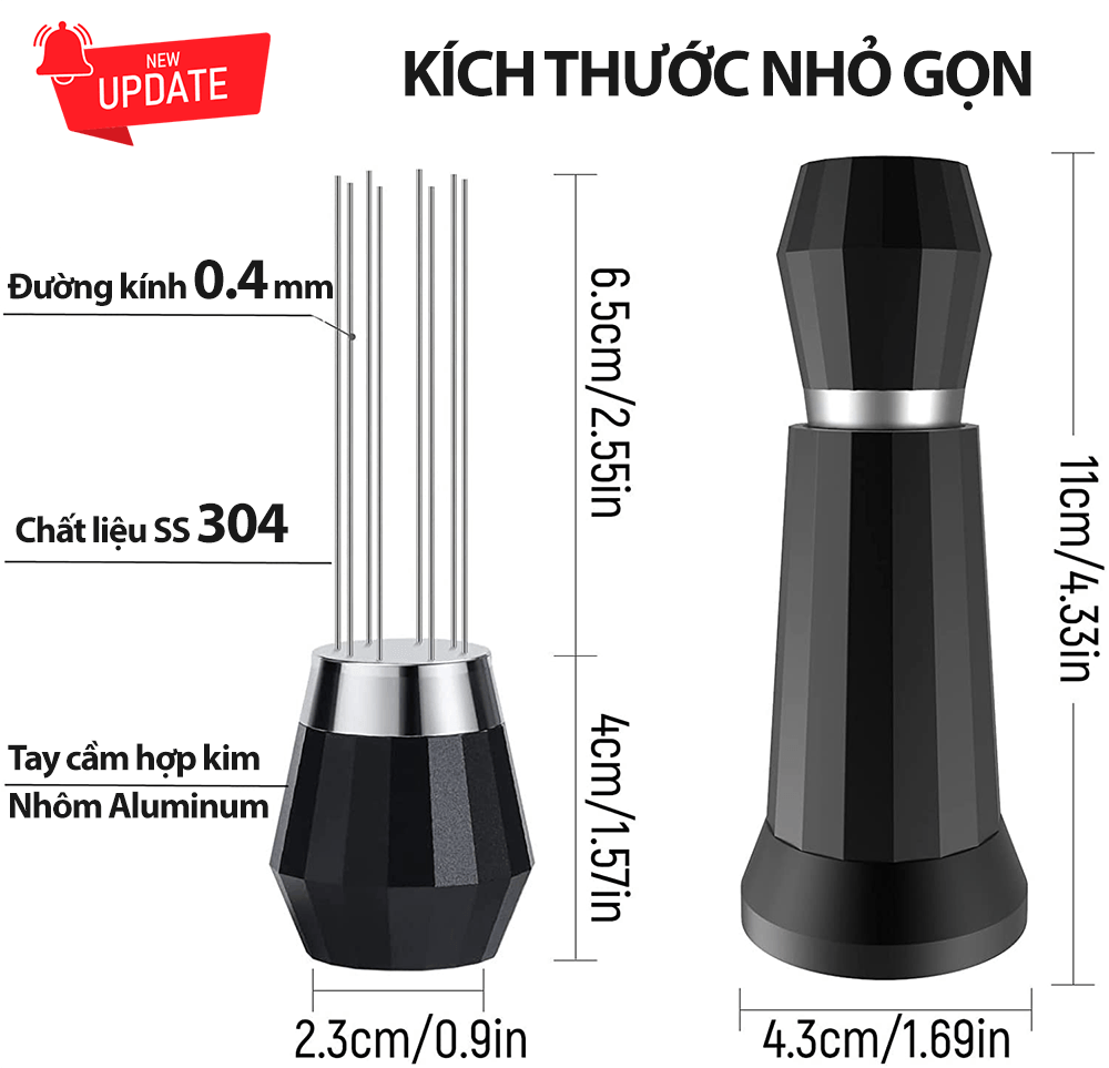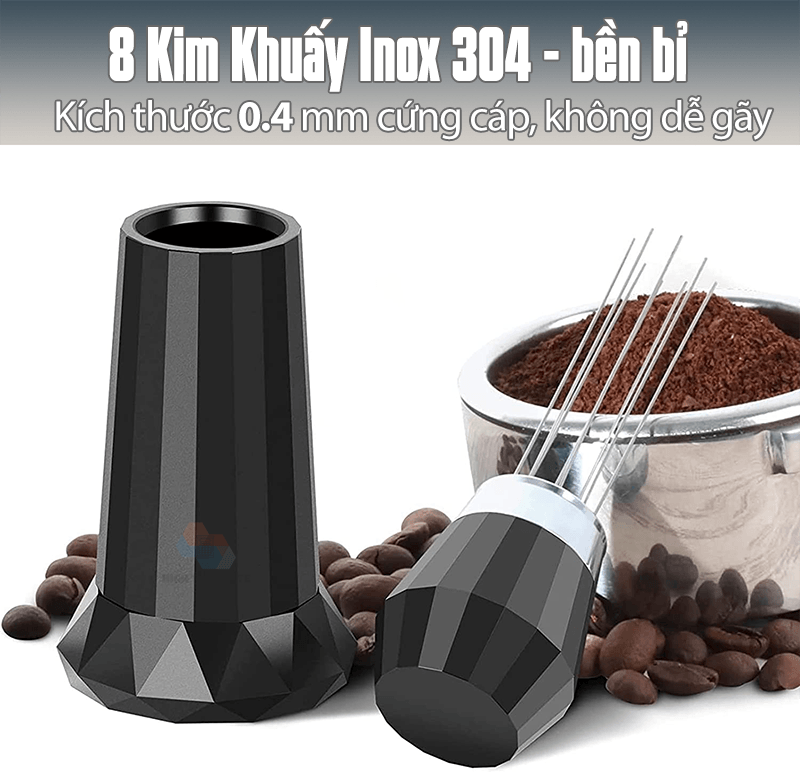 Kim đánh tơi bột cà phê WDT Một dụng cụ giúp ích cho việc pha chế các Espresso tuyệt vời, đạt chuẩn chất lượng nhanh chóng. Chống channeling Khi pha chế bằng máy pha cà phê Espresso, thông thường cà phê khi xay ra mịn sẽ làm vón cục, dẫn tới quá trình nén và chiết xuất họng pha sẽ không đồng đều, không đủ áp, xuất hiện hiện tượng channeling khi pha. Kim đánh tơi bột cà phê WDT sẽ rất hữu ích giúp cho việc phân bổ đồng đều cà phê bột bên trong, chống bị bón cục. Với thiết kế tám khi khuấy, là phiên bản nâng cấp của các WDT trước đây, giúp người dùng đánh tơi dễ hơn, và giảm thiểu thời gian đơn giản hơn. Sở hữu đường kính kim chỉ còn 0.4mm với chất liệu SS304 bền bỉ. Phiên bản cũ đã bị đánh bại hoàn toàn với đường kính này. Thiết kế có thể tháo rời toàn bộ các bộ phận riêng biệt. Vệ sinh Kim đánh tơi bột cà phê WDT dễ dàng mà đơn giản. Đặc biệt là phần Đế, giúp việc làm sạch bột cà phê lâu ngày quá tiện lợi