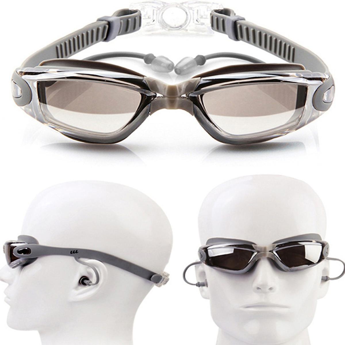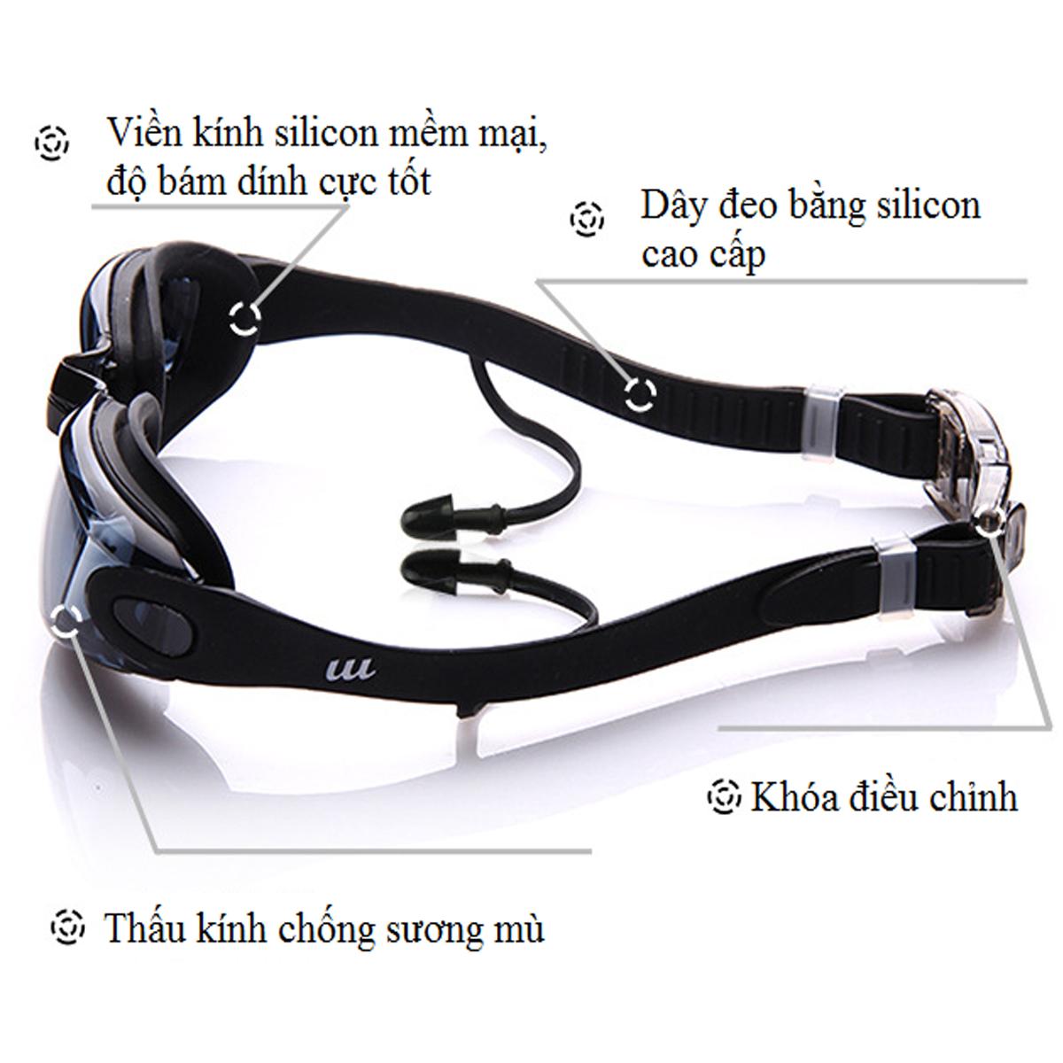 Kính bơi chống sương mù có nút bịt tai gồm Bịt Tai + Kẹp Mũi, kính bơi ngăn UV cao cấp. Tròng kính được làm từ chất liệu polycarbonate trong suốt, nhẹ, bền giúp người