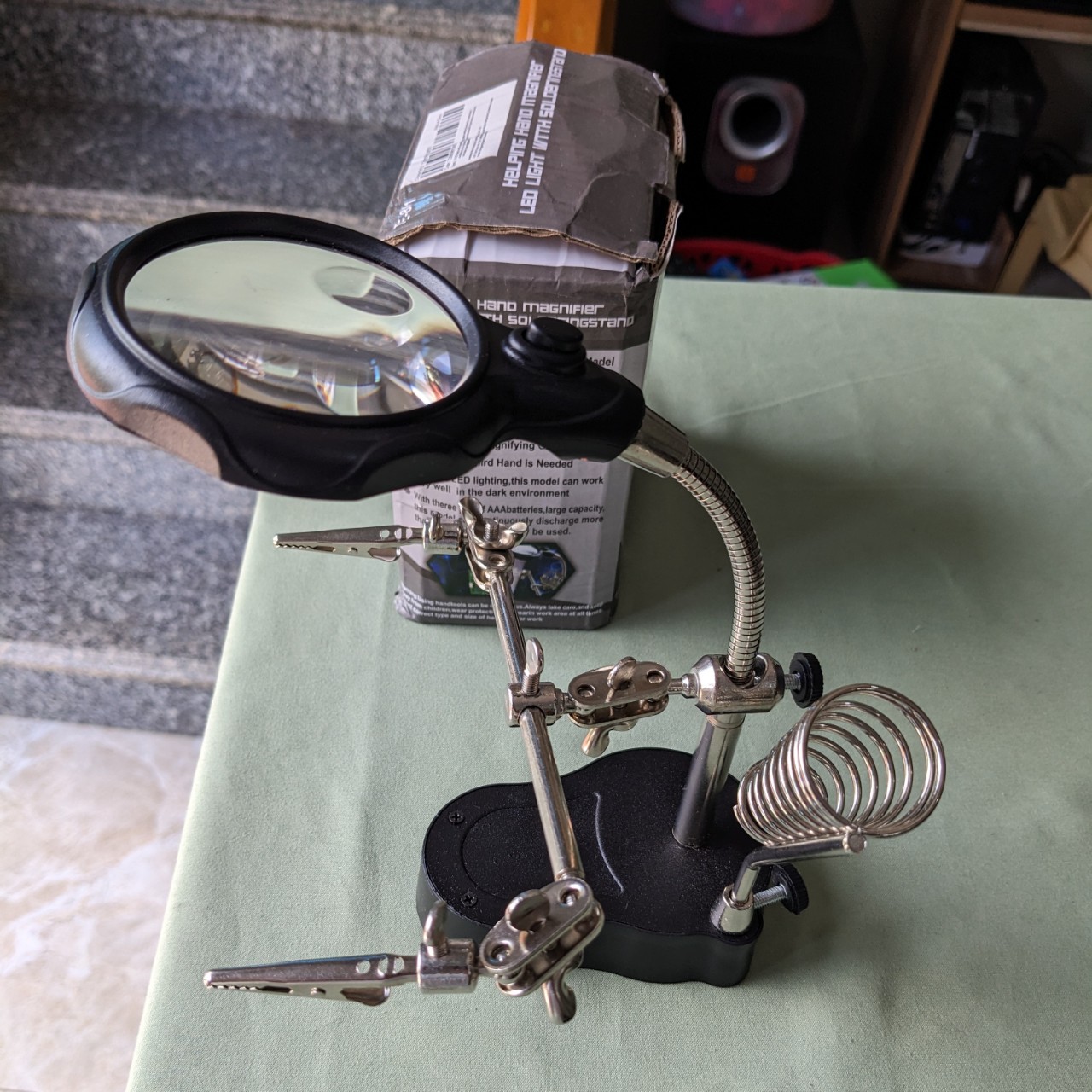 Kính lúp với độ phóng đại lớn, cho phép nhìn rõ các chi tiết nhỏ và mạch điện tử.