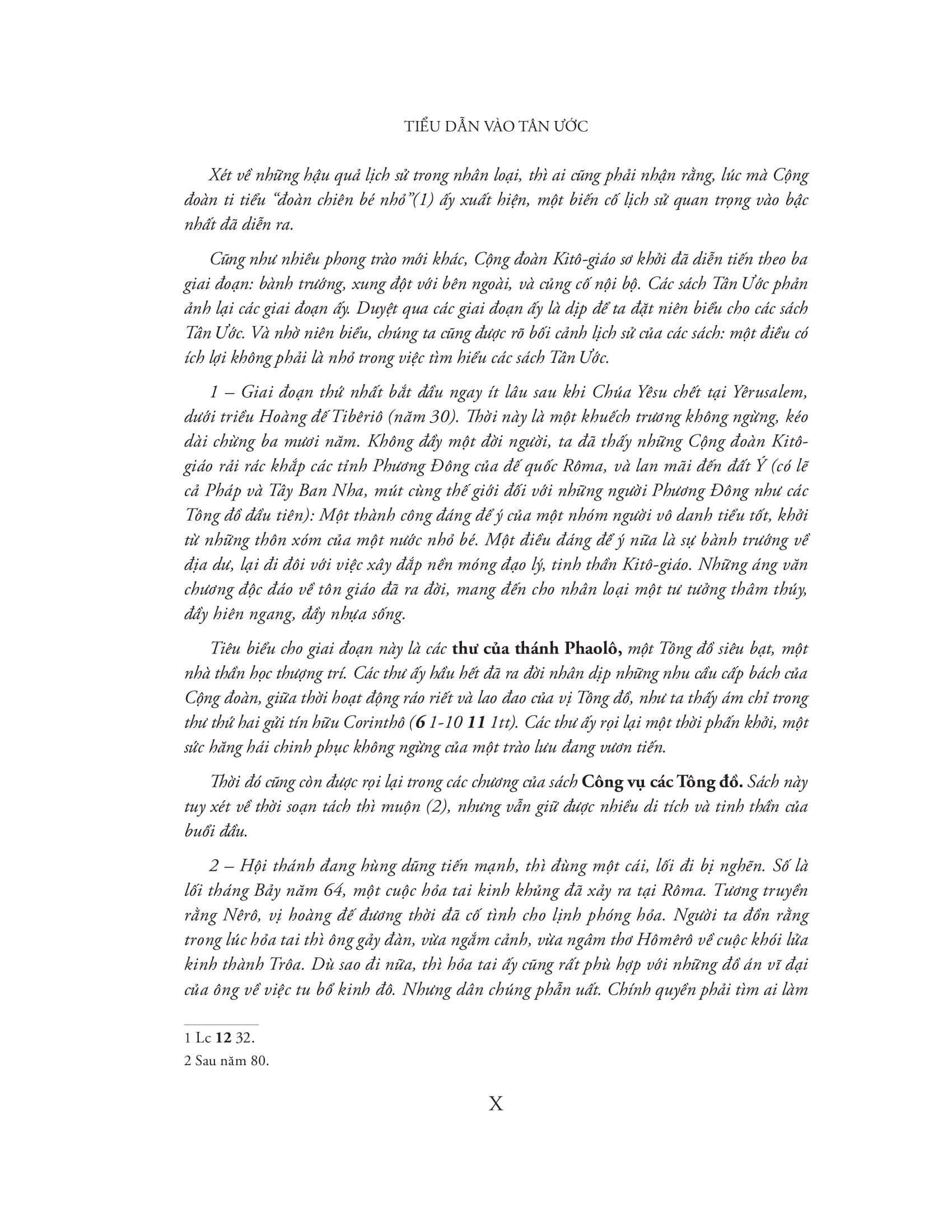 Lịch sử của Hội thánh bao gồm các quá trình khai sinh, bành trướng, xung đột với bên ngoài, và củng cố nội bộ của Cộng đoàn Kitô. Các sách Tân Ước phản ảnh lại các giai đoạn ấy. Duyệt qua các giai đoạn ấy là dịp để ta đặt niên biểu cho các sách Tân Ước. Và nhờ niên biểu, chúng ta cũng được rõ bối cảnh lịch sử của các sách: một điều có ích lợi không phải là nhỏ trong việc tìm hiểu các sách Tân Ước.