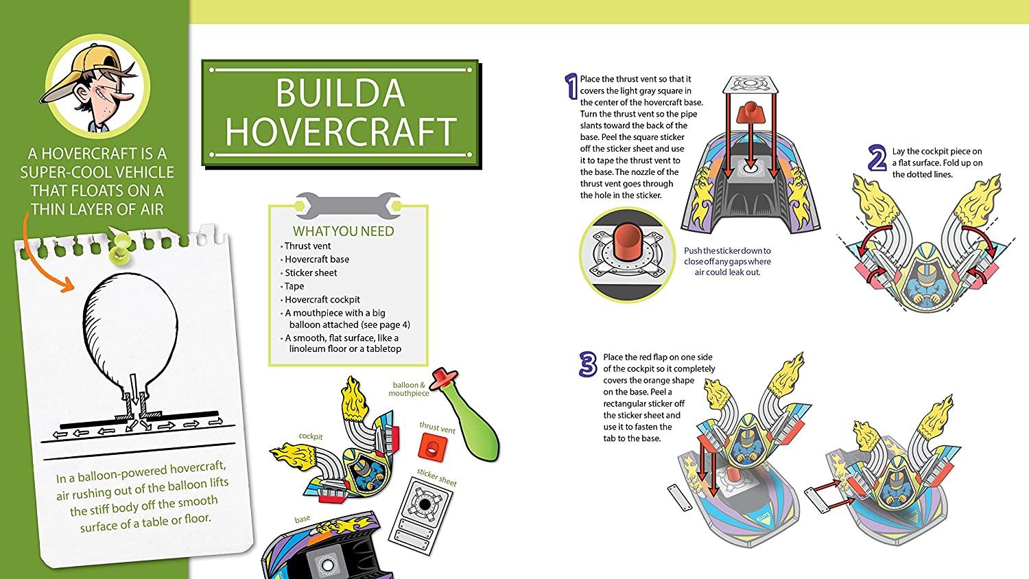 Air Power makes rocket science as easy as blowing up a balloon and letting go. This book and science kit in one delivers rocket-propelled fun with four easy-to-assemble vehicles -- race a sturdy cardstock hot rod across the floor, glide a hovercraft over the dining table, take flight with a helicopter, and blast off with an only-from-Klutz balloon-powered rocket. Tweak, tinker, and experiment to make your balloon-powered craft go as fast as can be. Our book contains super-clear building instructions, scientific principles, and real-world examples that make rocketry and jet propulsion simple. Air Power brings a breath ? make that a blast ? of fresh air to Sir Isaac Newton?s famous Laws of Motion. It turns out that rocket science is way too much fun to leave to the rocket scientists. Comes with: 48 page instruction book, 4 plastic parts (2 mouthpieces, thrust vent for hovercraft, blast cap), straws for blast pipes, 8 wheels, 4 axles, one hot-rod body, one hovercraft body, rocket fins and tube, helicopter blade assembly, three 9" balloons, two 6" balloons. Note: balloons contain Latex .