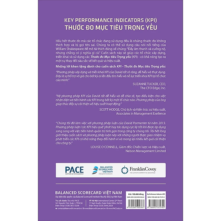 Tác giả: David Parmenter Biên dịch: Mai Chí Trung “Cái gì không đo được thì cũng không quản lý được; Cái gì không đo được thì cũng không cải tiến được.” – Peter Drucker (Cha đẻ Quản trị Kinh doanh hiện đại) Nhiều nghiên cứu trên khắp thế giới, trong đó có nghiên cứu của Robert Kaplan, Ram Charan, The Balanced Scorecard Institute và Tổ chức FranklinCovey, đã chỉ ra rằng:“70% thất bại của các doanh nghiệp ngày nay không phải là do chiến lược kém hay tầm nhìn sai, mà là do năng lực thực thi và hệ thống triển khai kém hiệu quả.” Con số trên cho thấy công tác đo lường hiệu suất công việc (Performance Management) đang được thực hiện thiếu hiệu quả trong rất nhiều tổ chức trên toàn thế giới, từ các tập đoàn đa quốc gia, cơ quan chính phủ cho đến các tổ chức phi lợi nhuận. Họ đã và đang áp dụng các thước đo mục tiêu vốn được đặt ra mà không có bất kỳ sự liên quan nào đến các nhân tố thành công quan trọng của tổ chức mình. Vậy làm sao để có thể sử dụng các thước đo mục tiêu một cách hiệu quả? KPI – Thước đo mục tiêu trọng yếu (Key Performance Indicators) chính là cuốn sách sẽ cung cấp công cụ và phương pháp để xây dựng hệ thống KPI hiệu quả dành cho mọi cá nhân, bộ phận và tổ chức. Nằm trong bộ sách “Triển khai chiến lược” do PACE dày công tìm kiếm, nghiên cứu và chọn lọc, có thể nói KPI là quyển sách được thực hiện công phu nhất, đầy đủ nhất và phổ biến nhất hiện nay. Cuốn sách này được biên soạn nhằm hỗ trợ các tổ chức trong việc xây dựng, triển khai và sử dụng hiệu quả các Thước đo Mục tiêu Trọng yếu (Key Performance Indicators; viết tắt KPI) – các thước đo hiệu quả công việc sẽ tạo ra sự khác biệt sâu sắc cho tổ chức của bạn. Tác giả của quyển sách, David Partmenter, là chuyên gia hàng đầu thế giới trong lĩnh vực KPI, thay thế quy trình hoạch định hàng năm bằng hoạch định cuốn chiếu hàng quý và các thông lệ tài chính tinh gọn. Ông đã phát triển các bước triển khai rõ ràng, giúp các nhà lãnh đạo tránh được những hạn chế trong quá trình sử dụng các KPI và tạo ra các KPI phản ánh một cách có ý nghĩa hiệu suất ngắn hạn và dài hạn của tổ chức. Việc triển khai dự án KPI phản ánh văn hóa, trạng thái sẵn sàng cho tương lai của tổ chức, mức độ cam kết của CEO và nhóm quản lý cấp cao, cũng như trình độ chuyên môn của đội ngũ nhân viên được tuyển chọn để tiến hành dự án. Với bất kỳ ai quan tâm đến KPI, thì tác phẩm của David Parmenter sẽ là lựa chọn hàng đầu.