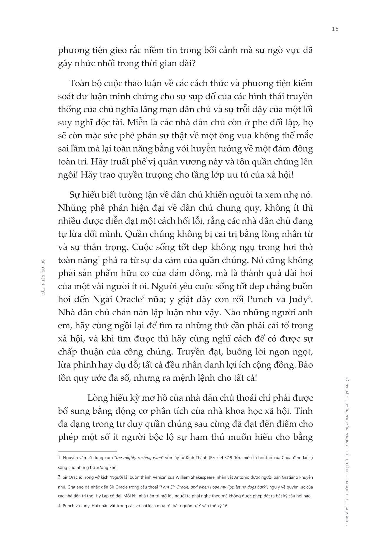 Kỹ thuật tuyên truyền trong thế chiến của Harold D. Lasswell tập trung vào việc phân tích định lượng và định tính nội dung tuyên truyền được các bên sử dụng trong hai thế chiến. Từ đó, ông đưa ra một số kết luận nổi bật, giúp người đọc hiểu rõ hơn chính sách tuyên truyền ảnh hưởng đến mọi khía cạnh của cuộc sống xuyên suốt thời chiến cũng như kết quả trực tiếp trên chiến trường như thế nào. Ngoài phân tích chuyên môn, Harold D. Lasswell còn sử dụng những phân tích liên ngành từ xã hội, lịch sử, tâm lý… nhằm lý giải cho sự ra đời cũng như thành bại của từng chính sách. Qua công trình nghiên cứu của Harold D. Lasswell, bạn đọc có thể tìm thấy những khuôn mẫu cũng như mô hình sơ khai sẽ đóng vai trò quan trọng trong quá trình hình thành lên nền tảng truyền thông hiện đại.