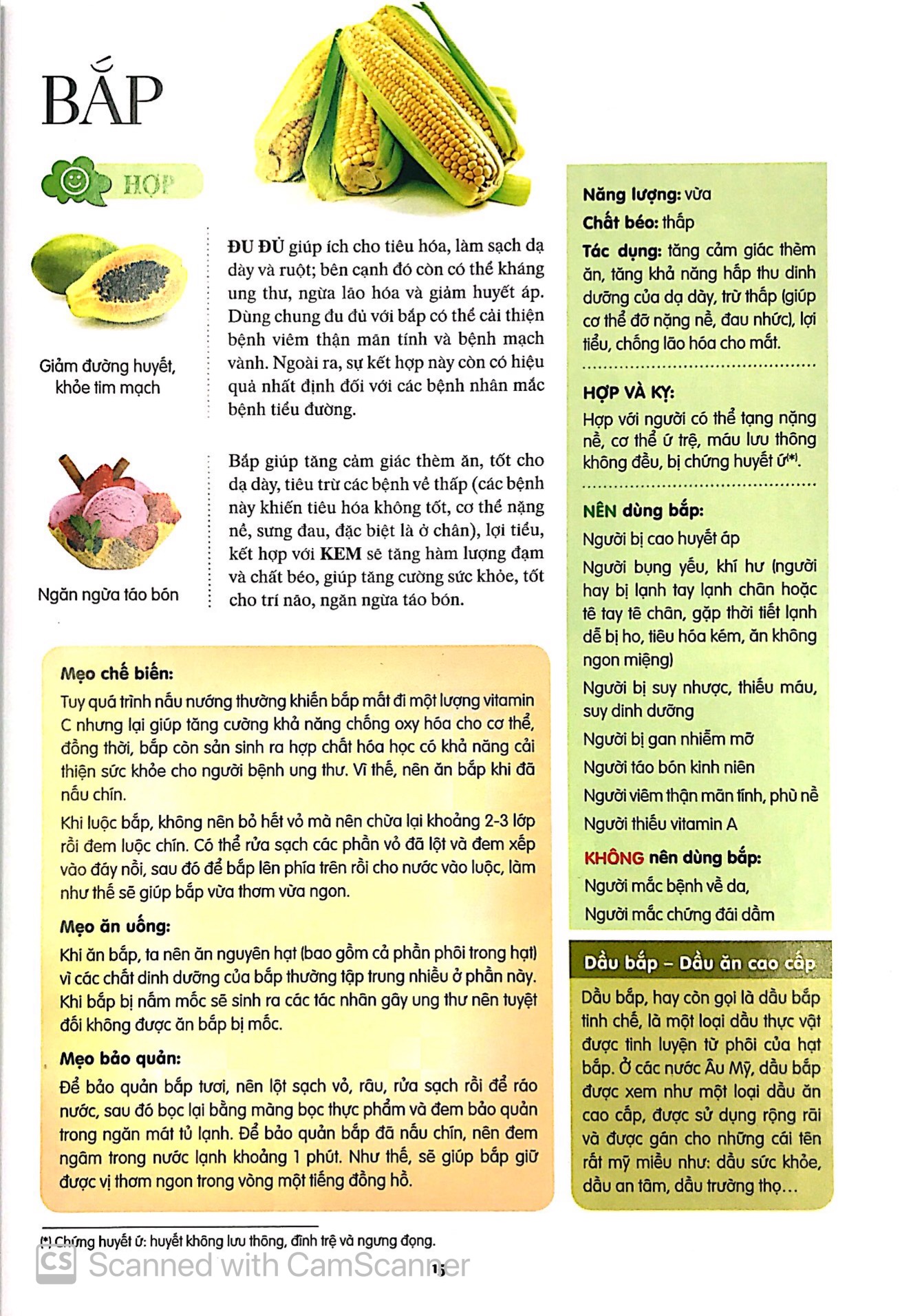 Cuốn sách trình bày khoa học một bên kỵ một bên hợp, những lợi ích và tác dụng của những loại thực phẩm này cùng những mẹo chế biến, mẹo chọn mua, mẹo bảo quản, nên dùng và không nên dùng…kèm với những hình ảnh cụ thể, sinh động giúp bạn đọc dễ dàng phân biệt, tương tác và nhận biết rõ ràng lợi ích và tác hại của những loại thực