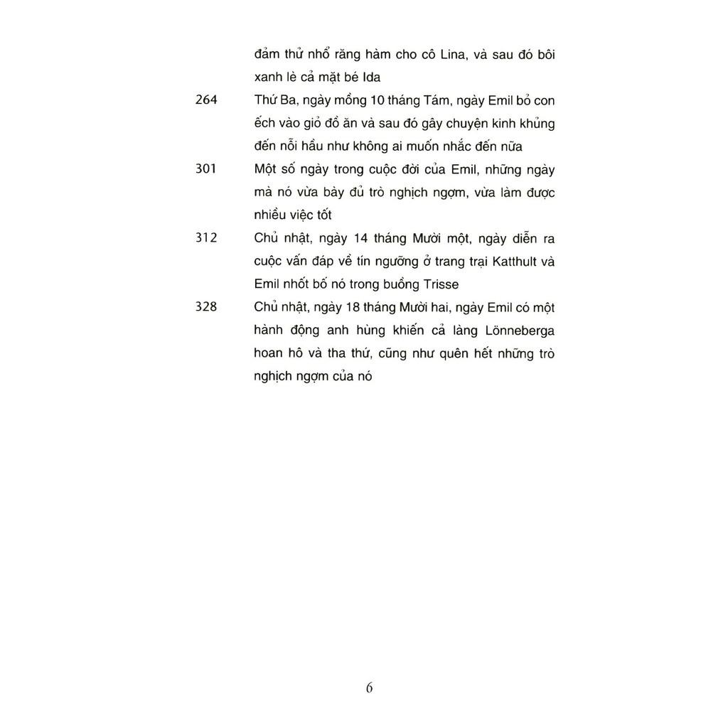 Và thế là, ở giữa nơi thấm đẫm sự bình yên tươi sáng của quê hương Astrid Lindgren, chẳng kém cạnh PippiT ất dài bằng món nghịch tối ngày đó, Emil trở thành một trong bộ đôi sứ giả văn chương được yêu mến nhất của nữ thánh văn học thiếu nhi Thụy Điển.