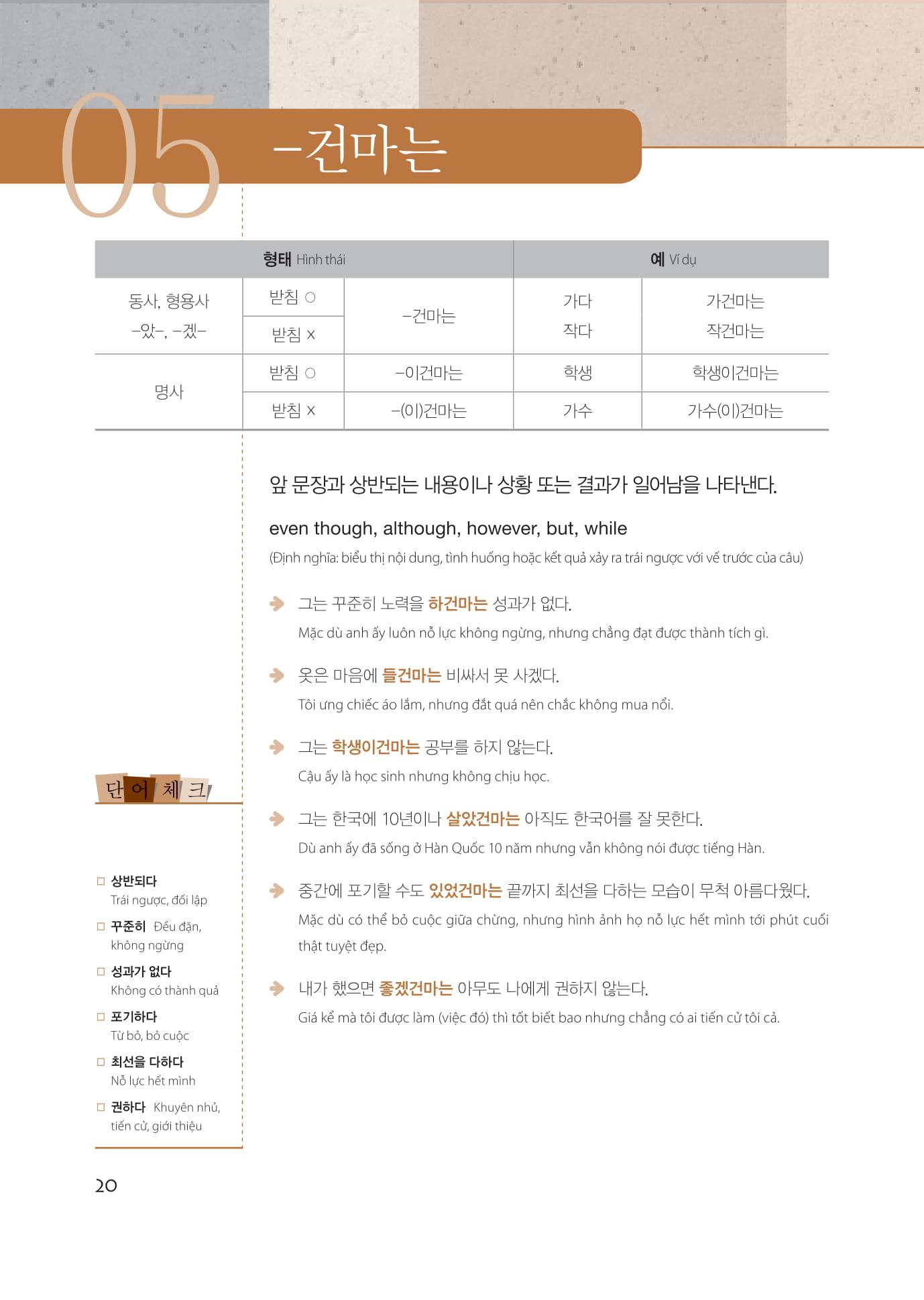Cung cấp kho từ vựng, ví dụ đa dạng, cũng như các dạng bài tập điển hình giúp người học làm quen chính xác ý nghĩa và cách sử dụng tiếng Hàn