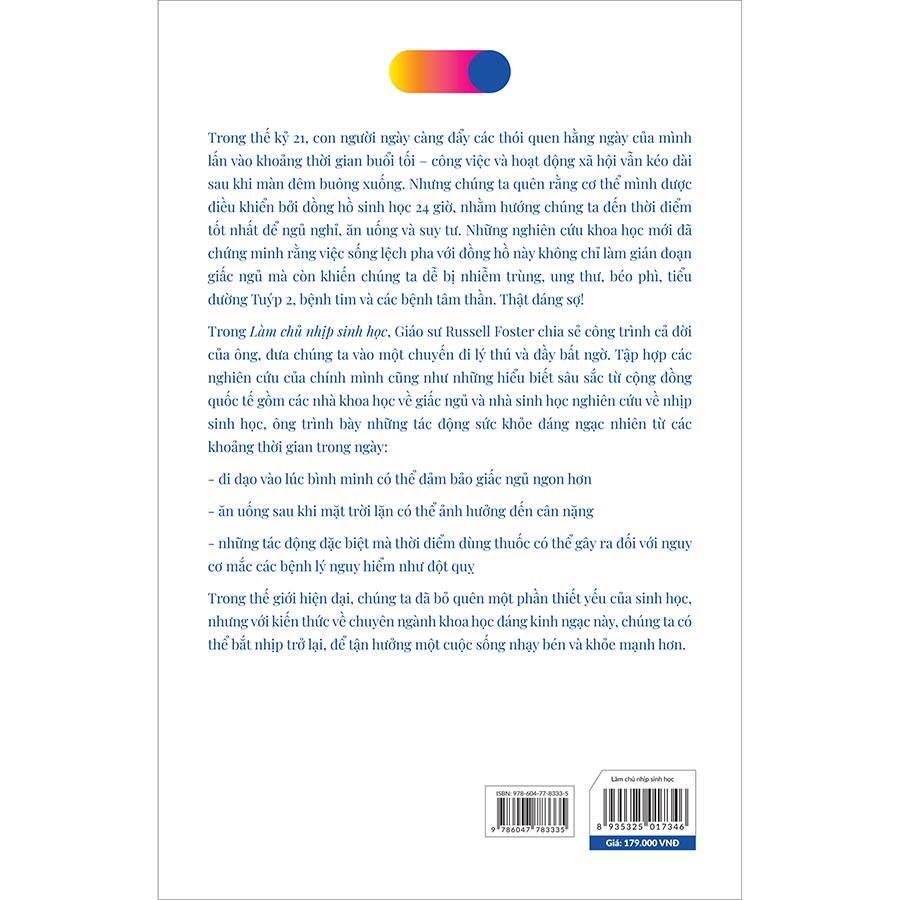 Trong Làm chủ nhịp sinh học, Giáo sư Russell Foster chia sẻ công trình cả đời của ông, đưa chúng ta vào một chuyến đi lý thú và đầy bất ngờ. Tập hợp các nghiên cứu của chính mình cũng như những hiểu biết sâu sắc từ cộng đồng quốc tế gồm các nhà khoa học về giấc ngủ và nhà sinh học nghiên cứu về nhịp sinh học, ông trình bày những tác động sức khỏe đáng ngạc nhiên từ các khoảng thời gian trong ngày: