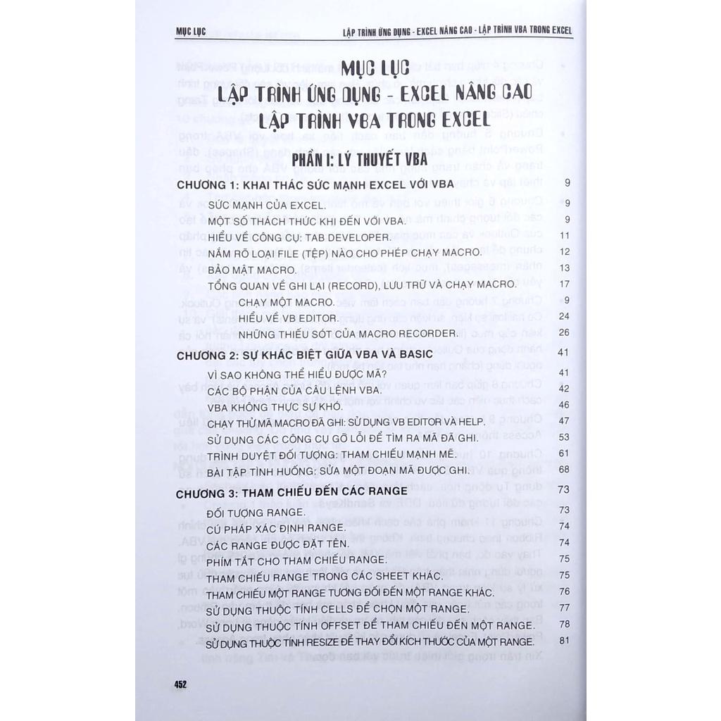 Mua tại TiktokNội dung sách gồm hai phần: I. Lý thuyết VBA: Khai thác sức mạnh Excel với VBA; Sự khác biệt giữa VBA và Basic; Tham chiếu đến các Range; Các công thức kiểu R1C1; Tạo và vận dụng các tên trong VBA. II. Thực hành VBA gồm các bài tập về tạo một Macro, MgsBox, Workbook và Worksheet, các biến, câu lệnh IF THEN, về lỗi Macro, xử lý chuỗi, ngày giờ, sự kiện, mảng, hàm và sub, đối tượng ứng dụng.