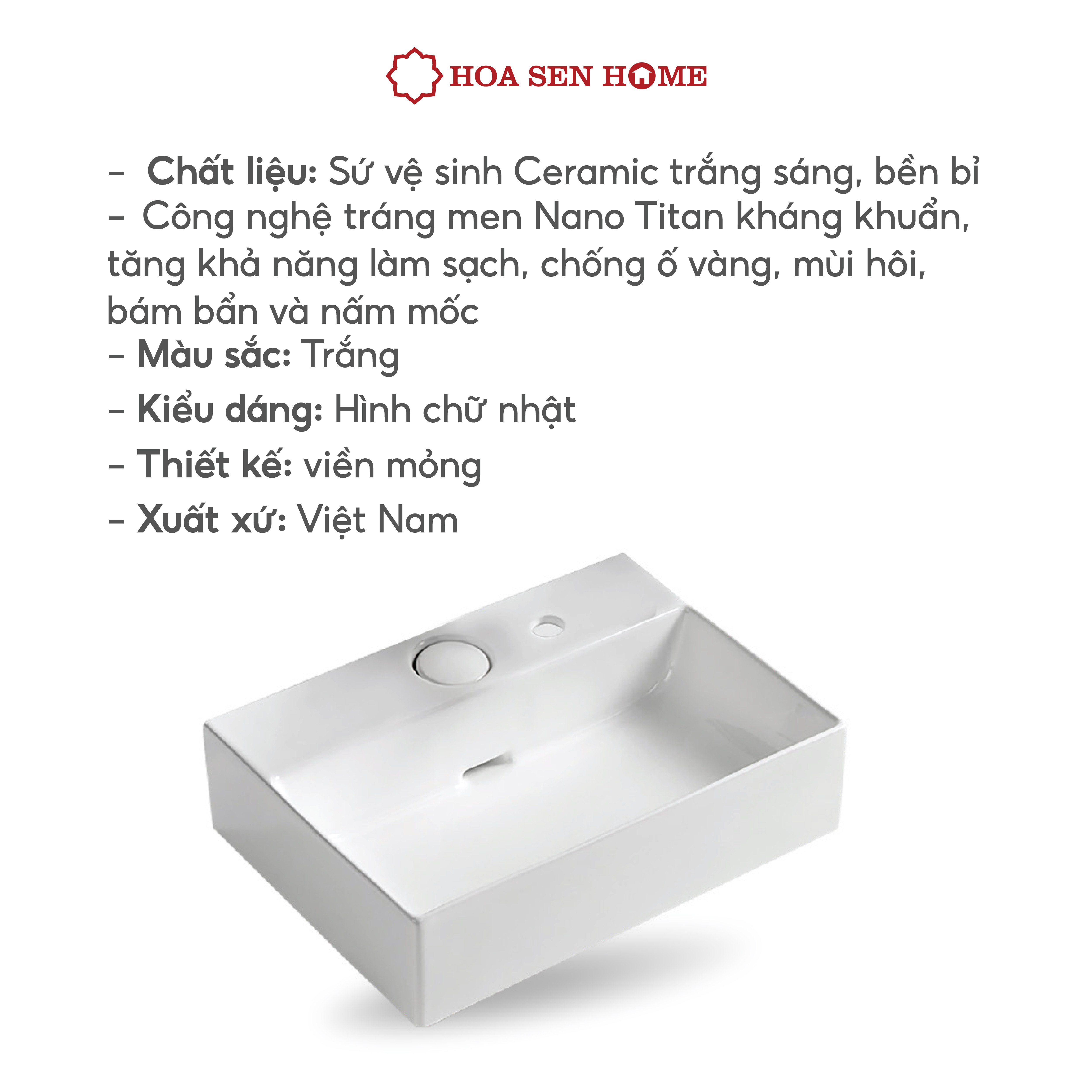 Kiểu dáng: Chậu vuông đặt bàn Công nghệ FFC hiện đại, vật liệu từ cao lanh chất lượng cao Nhiệt độ nung: 1280oC - kết tinh chất sứ bền bỉ Công nghệ nung ép nhiệt