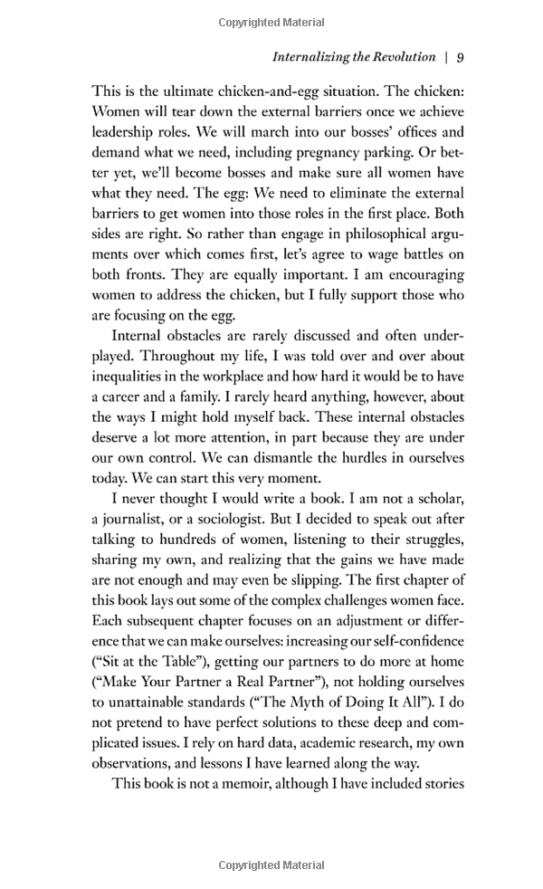 In Lean In, Sandberg digs deeper into these issues, combining personal anecdotes, hard data, and compelling research to cut through the layers of ambiguity and bias surrounding the lives and choices of working women. She recounts her own decisions, mistakes, and daily struggles to make the right choices for herself, her career, and her family. She provides practical advice on negotiation techniques, mentorship, and building a satisfying career, urging women to set boundaries and to abandon the myth of “having it all.” She describes specific steps women can take to combine professional achievement with personal fulfillment and demonstrates how men can benefit by supporting women in the workplace and at home.
