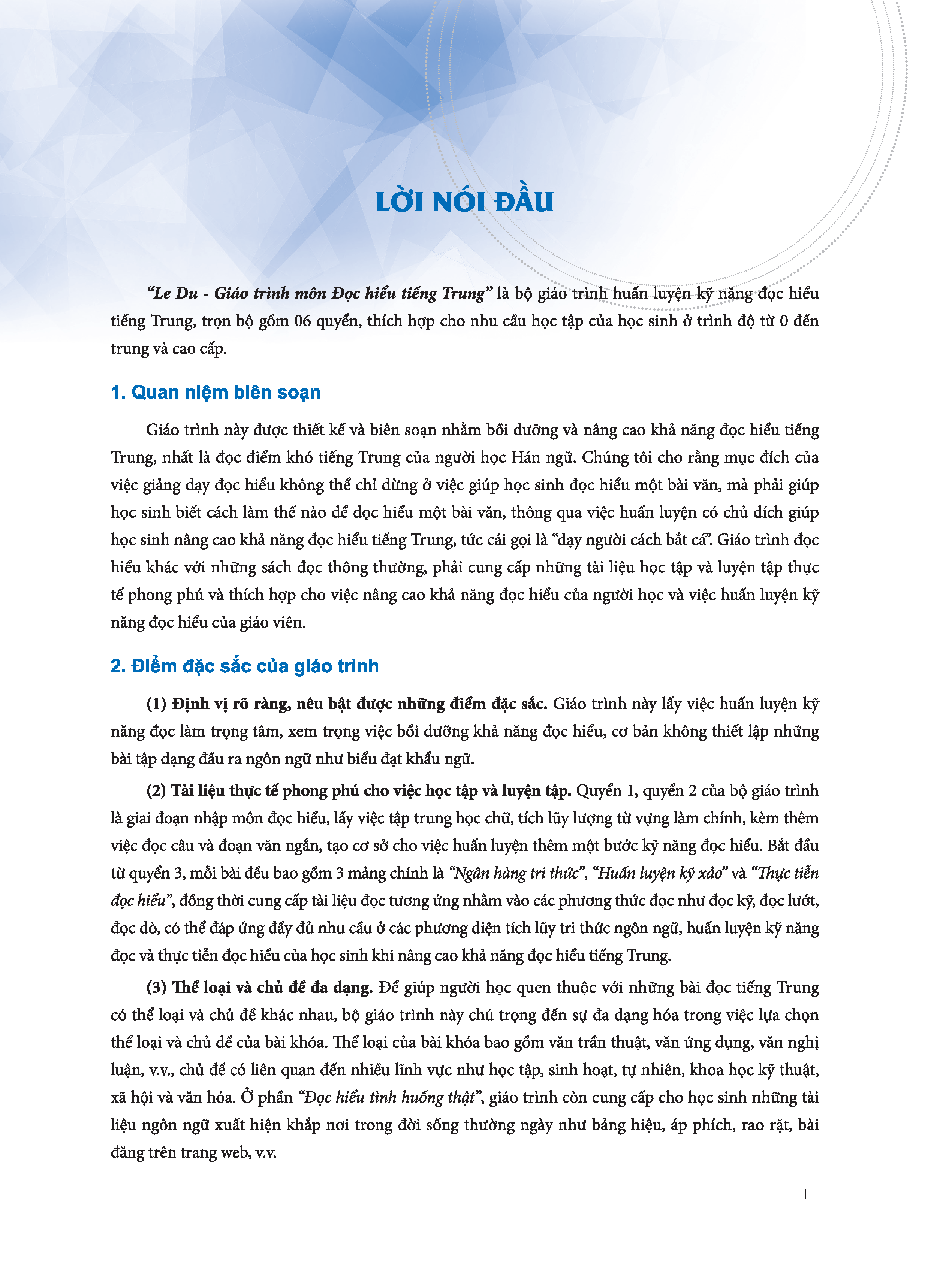 - Mục tiêu giảng dạy và đối tượng thích hợp sử dụng “Le Du - Giáo trình môn Đọc hiểu tiếng Trung, quyển 1” là giáo trình đọc hiểu cấp nhập môn. Mục tiêu giảng