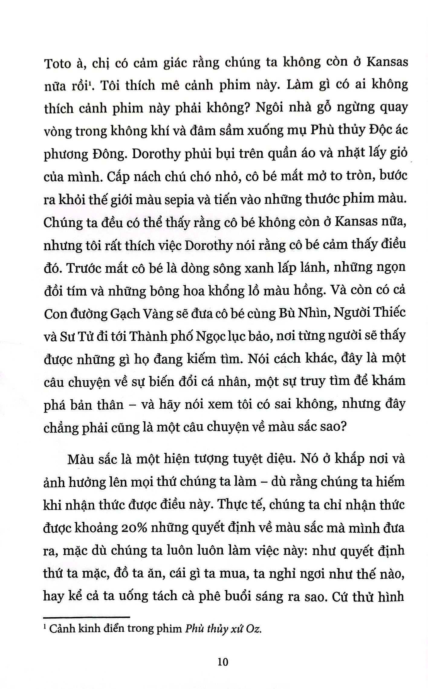 Khi bạn yêu màu sắc, nó sẽ yêu lại bạn. Bạn càng biết nhiều về nó, nó sẽ càng tăng cường chất lượng cuộc sống của bạn và nâng đỡ tâm hồn bạn. Hi vọng cuốn sách này trở thành cẩm nang gối đầu giường của bạn về màu sắc, nhờ đó bạn có thể lấy cảm hứng và học hỏi từ nó, dù là bạn muốn sử dụng màu sắc để dễ dàng phối trang phục, tạo ra những không gian hài hòa và đẹp mắt, tập trung và vui vẻ ở chỗ làm, cải thiện mối quan hệ hay chỉ là cảm thấy dễ chịu hơn ngay lập tức.
