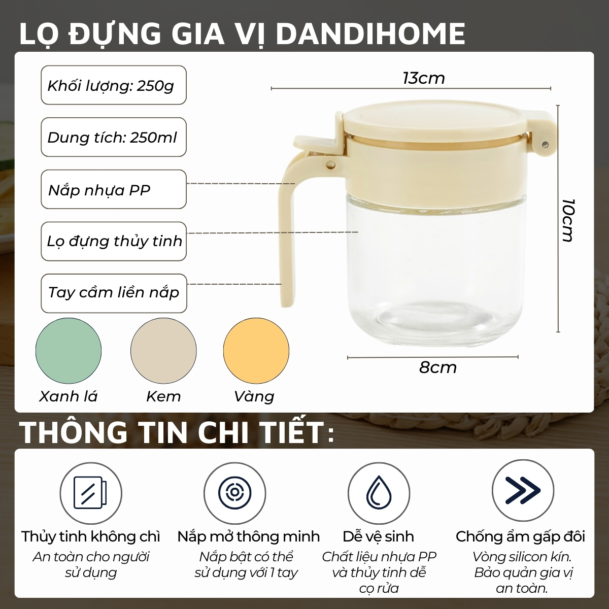 Mua tại TiktokLọ đựng gia vị thông minh DandiHome Thông tin chi tiết: + Kích thước: 13x10cm + Khối lượng: 250g + Dung tích: 250ml + Nắp nhựa PP: Nắp bật có thể sử dụng với 1 tay + Lọ đựng Thủy tinh không chì: An toàn cho người sử dụng + Tay cầm liền nắp + Màu: xanh lá, kem, vàng + Vòng silicon kín. Bảo quản gia vị an toàn. TẶNG muỗng GIA VỊ 3ML nhựa pp: Mỗi lọ đều được DandiHome tặng kèm 1 muỗng nhựa 3ml. Giúp bạn dễ dàng kiểm soát liều lượng gia vị chính xác.
