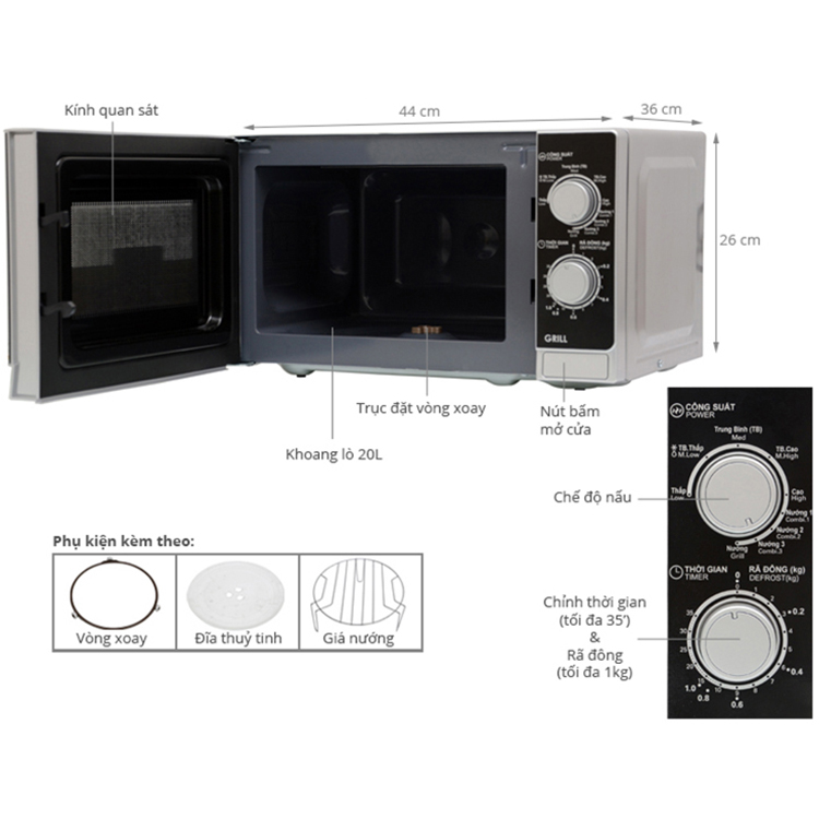 Tính năng nổi bật : – Bảng điều khiển cơ học dễ dàng sử dụng – 6 mức công suất linh hoạt cho ngưởi sử dụng – Tích hợp chức năng nướng tiện dụng – Thiết kế sang trọng hiện đại.   THÔNG SỐ KỸ THUẬT Đường kính đĩa 24,4cm Công Suất Đầu Ra (vi sóng) 700W Công Suất Đầu Vào(vi sóng) 1100W Điện Áp 220v-50hz Dung Tích Lò Vi Sóng 20L Trọng lượng khoảng 10,5 kg Công Suất Nướng 720W Kích thước bề ngoài (cm) 47 x 38 x 28.5