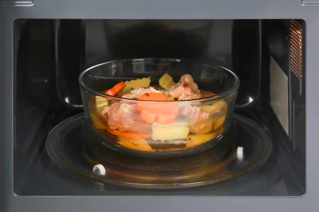 Lò vi sóng dung tích 20 lít, có thể bỏ vừa gà nguyên con 1kg Công suất vi sóng tối đa 1270W, nướng tới 1000W nấu nhanh Lò vi sóng có 4 chức năng chính: