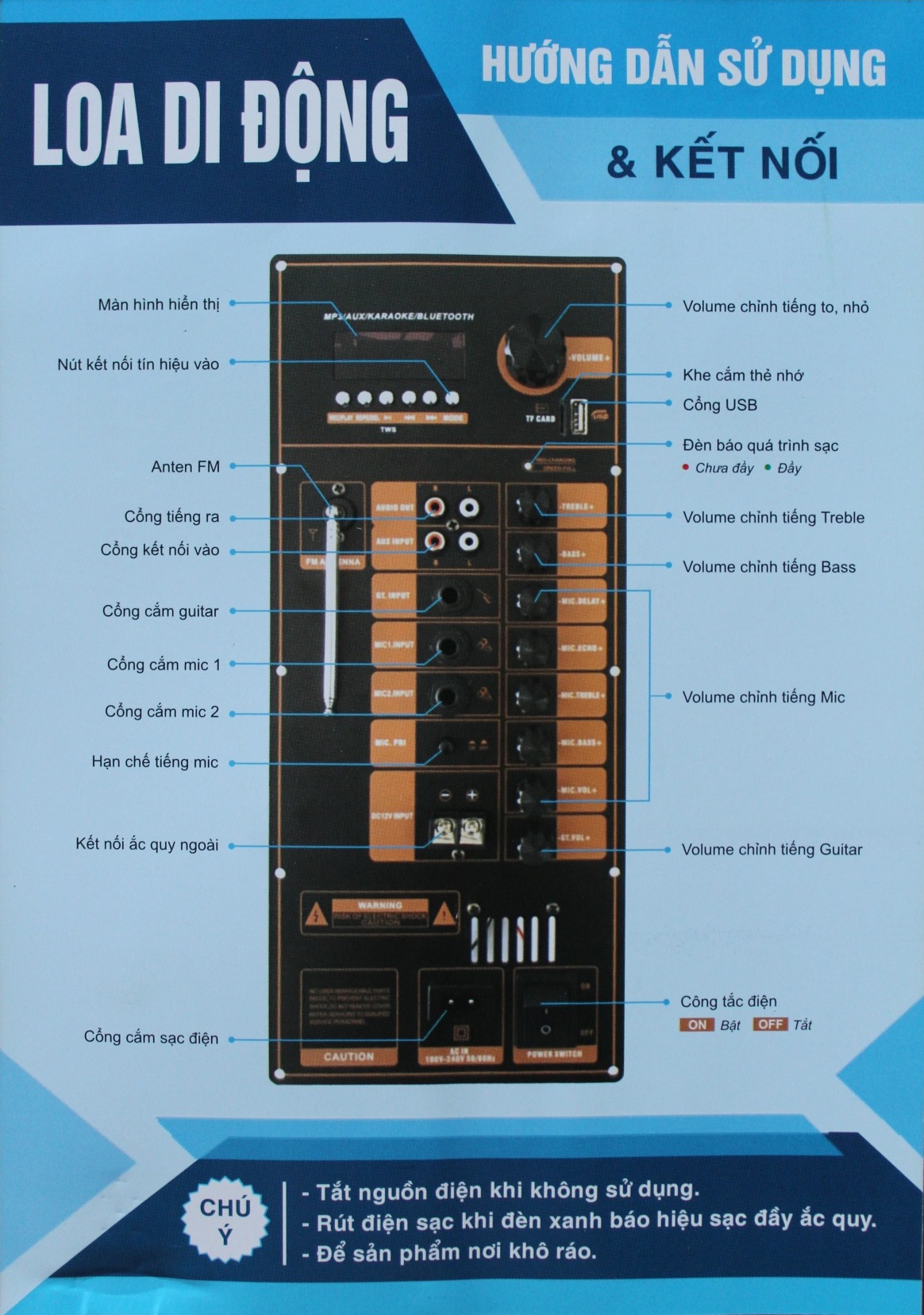_Nguồn AC, DC 12V bat in _Hỗ trợ USB, SD CARD, Bluetooth, guitar in, mic in _Bass loa ≈40cm, Treble x 1, Mid x 1 _Loa 3 đường tiếng _Phụ kiện 2 mic cầm tay