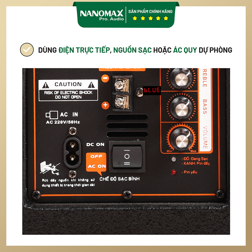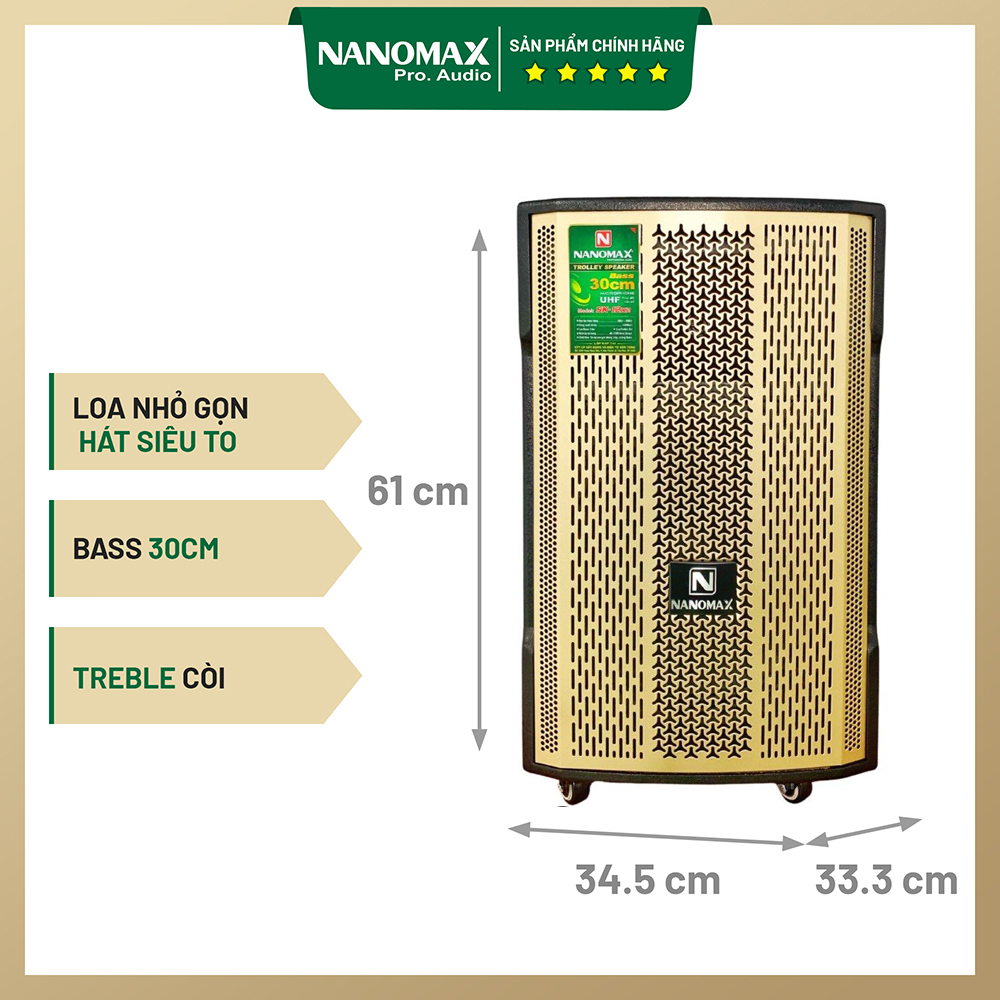 Loa kéo Nanomax SK-12F3 có Bass 30 cm (3 tấc) với công suất lớn 450 watt phù hợp hát karaoke gia đình hoặc ngoài trời với kết nối bluetooth phạm vi không gian siêu rộng, thời lượng pin lâu bền bỉ với loa 2 đường tiếng cho âm thanh hay sống động. THÔNG SỐ KỸ THUẬT LOA KÉO NANOMAX SK-12F3: • Loại: Karaoke di động • Mã: SK-12F3 • Số lượng kênh: 2 đường tiếng • Công suất: 450W • Thời gian sạc: 3-4 tiếng • Thời gian pin: 5-8 tiếng tùy âm lượng • Tiện ích: Cổng USB, thẻ nhớ • Kết nối không dây: Bluetooth 5.0 xa 15m, Mic UHF • Kết nối khác: Jack RCA Audio IN/OUT kết nối Micro có dây và Đàn Guitar bên ngoài • Kích thước/ Trọng lượng: (42 x 41 x 72)cm / 23.5kg • Trọng lượng đóng gói: (49x47x78)cm / 26kg • Chất liệu thùng: Gỗ sơn gai chống trầy • Sản xuất tại: Việt Nam • Bảo hành loa bass, treble và bo mạch chính: 12 tháng • Số lượng loa: 1 loa bass 3 tấc + 1 loa treble họng còi • Sử dụng nguồn: AC 220V hoặc Ắc qui 12V • Phụ kiện: 1 dây sạc, 2 micro và 4 pin ️ CHẾ ĐỘ BẢO HÀNH ️ 1 đổi 1 trong 7 ngày nếu lỗi nhà cung cấp Thời gian bảo hành: 12 tháng ️GIỜ LÀM VIỆC CỦA SHOP ️ Tất cả các ngày trong tuần từ 7h30 đến 5h ( Nghỉ Chủ Nhật và Các Ngày Lễ ). ️ Follow shop để được áp mã giảm giá cho khách hàng thân thiết. ️ CAM KẾT CỦA SHOP ️ • Cung cấp những sản phẩm chính hãng với chất lượng phù hợp với giá tiền • Sản phẩm luôn được test kỹ trước khi đóng gói và vận chuyển • Hỗ trợ tư vấn / Hướng dẫn sử dụng 24/7 thông qua Chat • Thời gian đổi trả theo đúng quy định