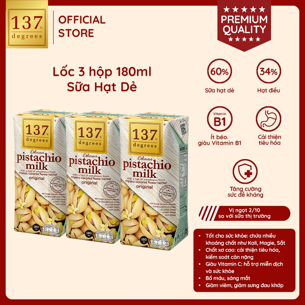 Sữa hạt 137 Degrees là thương hiệu sữa hạt dinh dưỡng số 1 tại Thái Lan, với thành phần hạt tươi nguyên chất đến 99% KHÔNG ĐƯỜNG, KHÔNG CHẤT BẢO QUẢN, KHÔNG PHA TRỘN SỮA BÒ/ SỮA ĐẬU NÀNH, dùng mật hoa dừa hữu cơ tạo vị ngọt thanh nhẹ cho sữa, nguồn hạt hạnh nhân chất lượng từ California, Hoa Kỳ.
