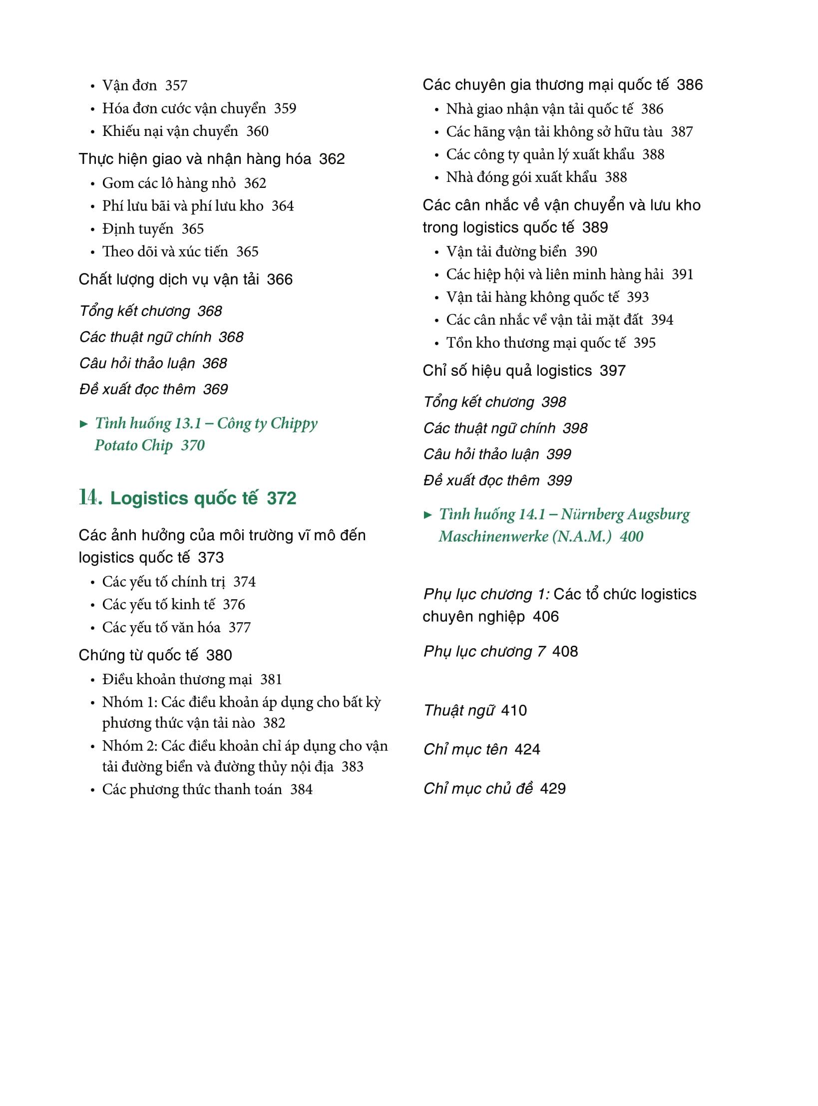 Logistics và Quản trị chuỗi cung ứng là một cuốn “bách khoa toàn thư” mang đến những kiến thức, hướng dẫn đầy đủ nhất về Logistics và quản trị chuỗi cung ứng đương đại. Điều đó sẽ mang đến cho độc giả những thông tin và kiến thức chính xác, bổ ích nhưng vẫn vô cùng dễ dàng tiếp thu, giúp độc giả dễ dàng hơn trong việc tìm hiểu và nghiên cứu về ngành nghề “mắt xích phát triển kinh tế” này. Quyển textbook này sẽ giúp bạn nắm rõ từ kho vận đến giao nhận một cách dễ dàng với 3 phần chính: Tổng quan về Logistics, Quản trị chuỗi cung ứng và Các thành tố của hệ thống Logistics. Mỗi phần sẽ tiếp tục chia ra thành các mục nhỏ, bảo đảm sẽ giúp bạn hiểu tường tận từng ngõ ngách của Logistics và quản trị chuỗi cung ứng.