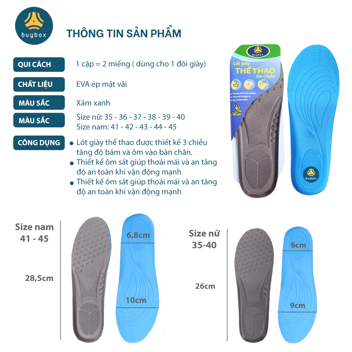Thông tin cơ bản: - Sản phẩm: Đế lót giày thể thao - Màu sắc: Nền xám - bề mặt xám, nền xanh - bề mặt đen - Kích thước: 35-36, 37-38, 39-40, 41-42, 43-44,