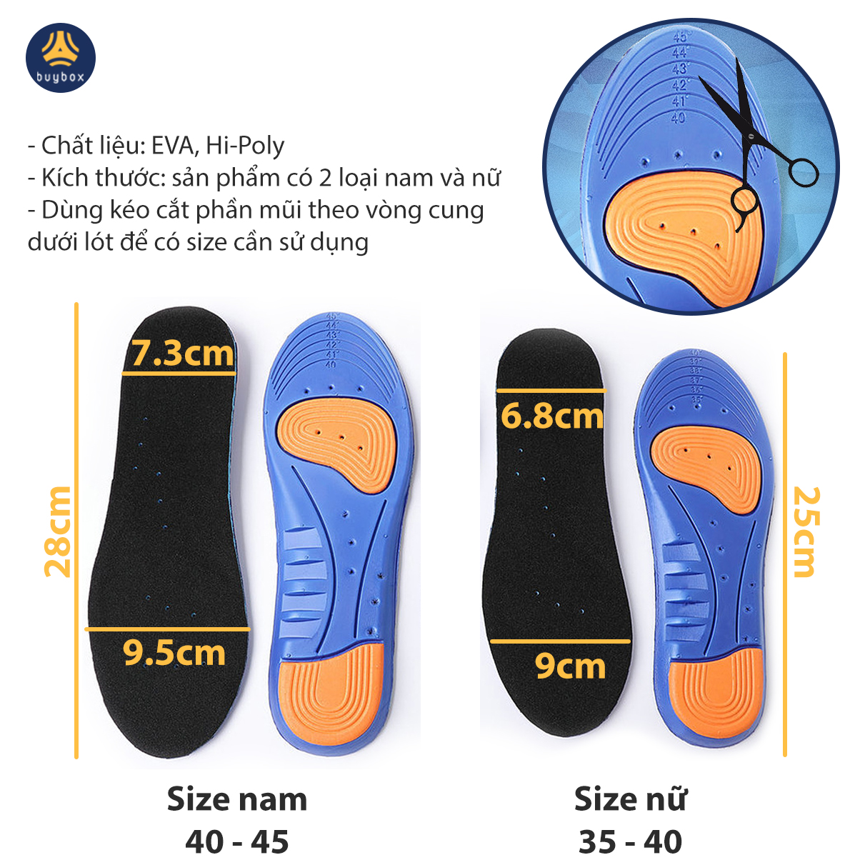 Sản phẩm chỉ có 2 loại kích thước, dùng chung cho các size giày nữ 35 - 36 - 37 - 38 - 39 - 40 và loại nam dùng cho size 40 - 41 - 42 - 43 - 44 - 45 - 46. Sử dụng kéo cắt theo đường cong mặt dưới lót để có size cần dùng.