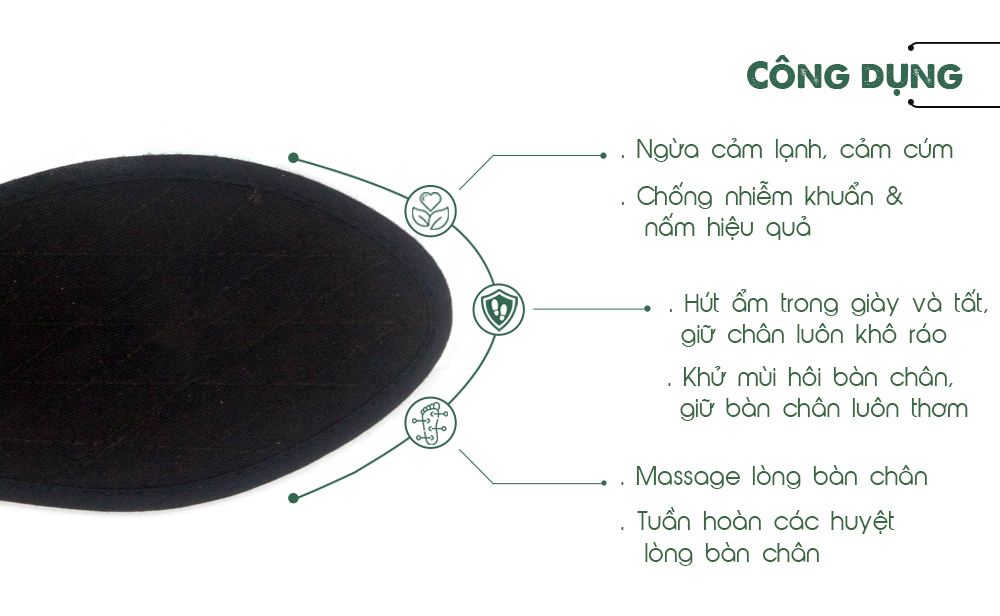 CÔNG DỤNG CỦA LÓT GIÀY QUẾ VẢI COTTON CI-03 Được làm từ nguyên liệu Quế Trà My nên có rất nhiều công dụng như: - Diệt nấm, vi khuẩn tồn tại trong giày.