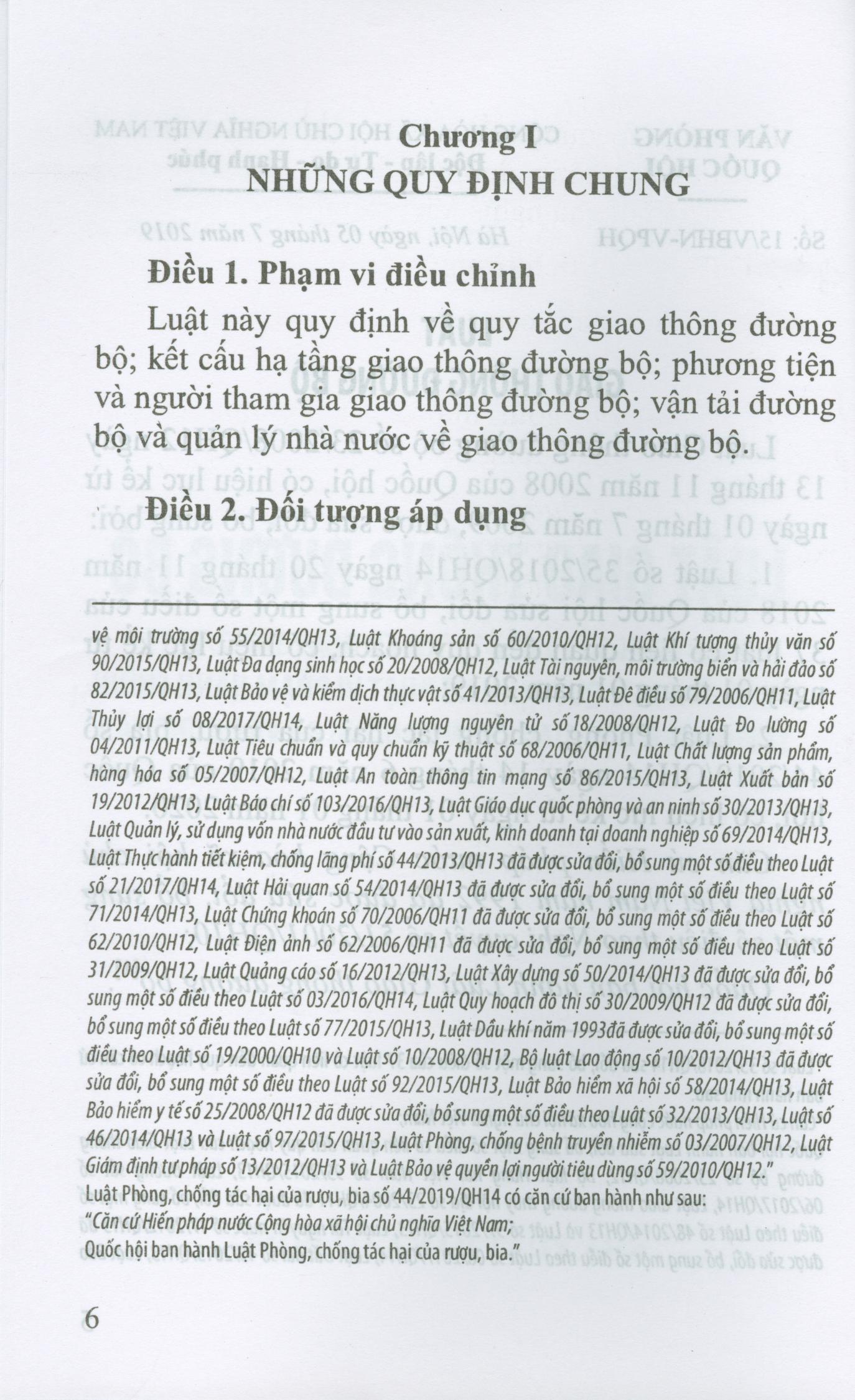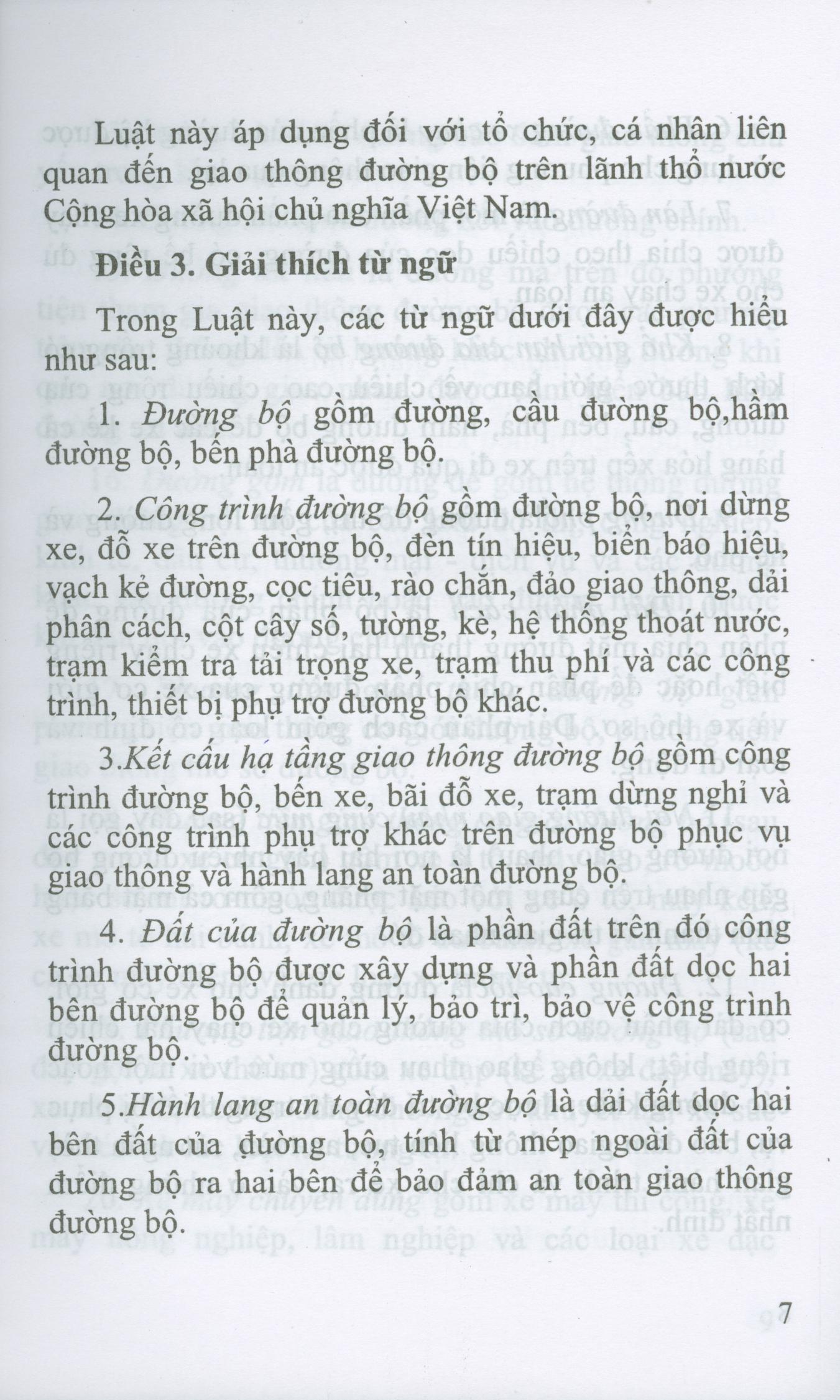 Mua tại TiktokĐiều 1. Phạm vi điều chỉnh Luật này quy định về quy tắc giao thông đường bộ; kết cấu hạ tầng giao thông đường bộ; phương tiện và người tham gia giao thông đường bộ; vận tải đường bộ và quản lý nhà nước về giao thông đường bộ. Điều 2. Đối tượng áp dụng Luật này áp dụng đối với tổ chức, cá nhân liên quan đến giao thông đường bộ trên lãnh thổ nước Cộng hòa xã hội chủ nghĩa Việt Nam. Điều 3. Giải thích từ ngữ Trong Luật này, các từ ngữ dưới đây được hiểu như sau: