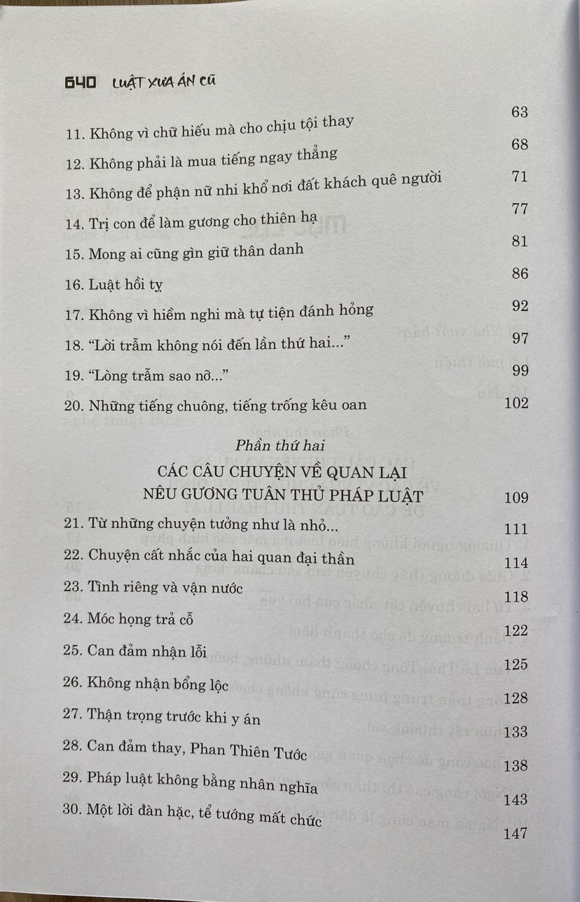 Mua tại TiktokTrong cuốn sách, tác giả đã công phu tập hợp 136 câu chuyện pháp luật thời phong kiến, được ghi lại trong các bộ chính sử của nước nhà; phân tích kỹ các tình tiết của các câu chuyện pháp luật, trong đó nhiều câu chuyện là những vụ án nổi tiếng trong lịch sử phong kiến Việt Nam, với sự có mặt của đủ các giai tầng xã hội từ vua chúa, đội ngũ quan lại các cấp, đến những người dân bình thường; liên quan tới rất nhiều mặt của đời sống xã hội.