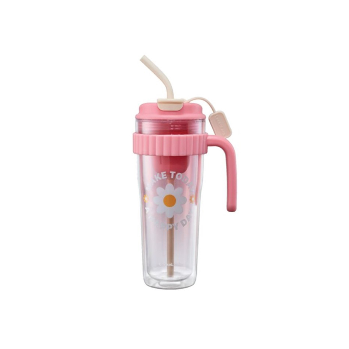 Ly nhựa 2 lớp có tay cầm 890ml LocknLock màu hồng HAP538PIK, Hàng chính hãng, họa tiết dễ thương, kèm ống hút silicone - JoyMall