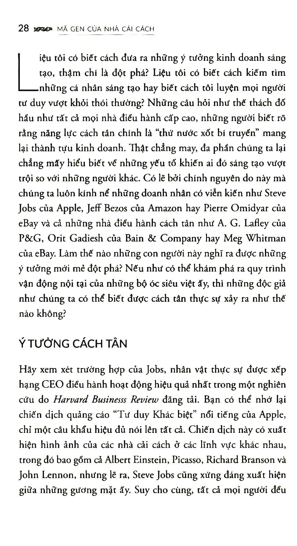 Cách tân - đó chính là nhân tố cốt tử của nền kinh tế toàn cầu, đồng thời là ưu tiên chiến lược của hầu như mọi CEO trên toàn thế giới. Trên thực tế, một khảo sát gần đây của hãng IMB thực hiện với 500 CEO đã nhận diện “khả năng sáng tạo” là vị trí “năng lực lãnh đạo” số một của tương lai. Sức mạnh của những ý tưởng cách tân nhằm cách mạng hóa các ngành nghề, lĩnh vực cũng như sản sinh ra thịnh vượng đã quá ư rõ ràng suốt chiều dài lịch sử: Chiếc iPod của hãng Apple vượt mặt Walkman của Sony, hạt cà phê cùng bầu không khí của Starbucks nhấn chìm các tiệm cà phê truyền thống, Skype vận dụng chiến lược “miễn phí” để đánh bại AT&T cùng Tập đoàn Viễn thông Anh quốc (British Telecom), eBay nghiền nát những quảng cáo phân loại, còn hãng Hàng không giá rẻ Southwest Airlines thì cất cánh ngay bên dưới tầm thống trị của America Airlines và Delta Airlines. Trong mọi ví dụ, những ý tưởng sáng tạo của các doanh nghiệp cách tân đều cho ra lợi thế cạnh tranh mạnh mẽ cùng của cải kếch xù cho công ty nào giành phần tiên phong. Hẳn nhiên là, câu hỏi đáng giá cả triệu đô khi nhìn lại, làm thế nào họ đạt được những điều như vậy? Và có lẽ câu hỏi trị giá cả chục triệu đô khi hướng tới tương lai là, làm thế nào tôi thực hiện được điều đó?