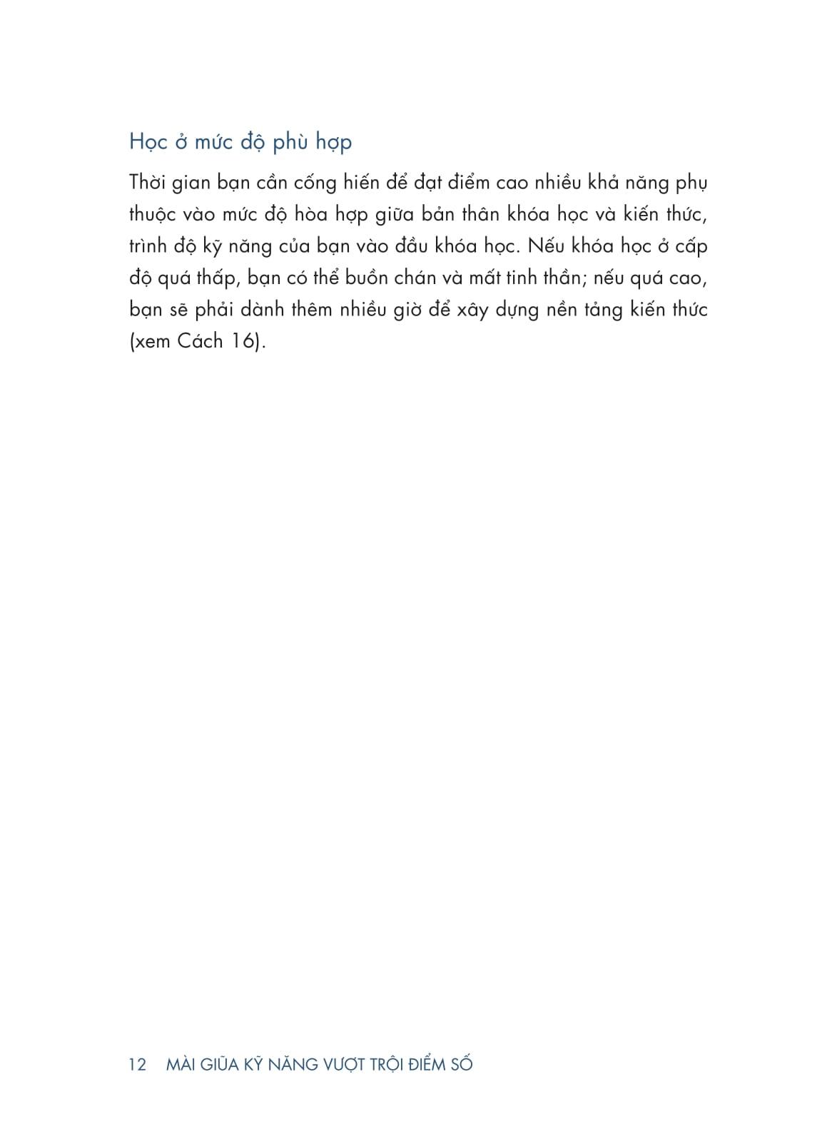 Mài Giũa Kỹ Năng - Vượt Trội Điểm Số “Cùng một cách làm nhưng tại sao mình lại không được đánh giá cao?”, “Tại sao miệt mài học ngày học đêm mà điểm số vẫn lẹt đẹt?”, “Làm thế nào để không uể oải khi nhắc đến việc học?” - đó là những băn khoăn luôn thường trực trong tâm trí, cùng nỗi sợ “không đủ điểm” có thể kéo tinh thần của người học xuống bất cứ lúc nào. MÀI GIŨA KỸ NĂNG – VƯỢT TRỘI ĐIỂM SỐ với 50 mẹo nhỏ linh hoạt mà hữu ích cần có cho các bạn học sinh/sinh viên với các chỉ dẫn chi tiết: tự lên lộ trình học tập cho riêng bản thân; kiểm soát thời gian trong việc ôn tập và các kỳ thi; tinh chỉnh bài làm để đạt thêm điểm cộng; chọn lọc kiến thức một cách chủ động và bồi dưỡng sức khỏe tinh thần. Đây cũng là cuốn sách thứ 3 trong bộ Cẩm nang sinh viên, được viết bởi Stella Cottrell – chuyên gia giáo dục và hướng nghiệp người Anh, tác giả của Lộ trình bạn đi Tương lai bạn chọn và Tháo gỡ căng thẳng Mở lối tiềm năng – những cuốn sách hữu ích nổi tiếng với các bạn trẻ. Hãy “note” lại trong trí óc để nhớ kỹ hơn rằng, chỉ cần một chiến lược phù hợp thì gần như ai cũng đủ khả năng đạt được điểm số tuyệt đối, tiến tới thành công. Và đương nhiên, bạn cũng thế!