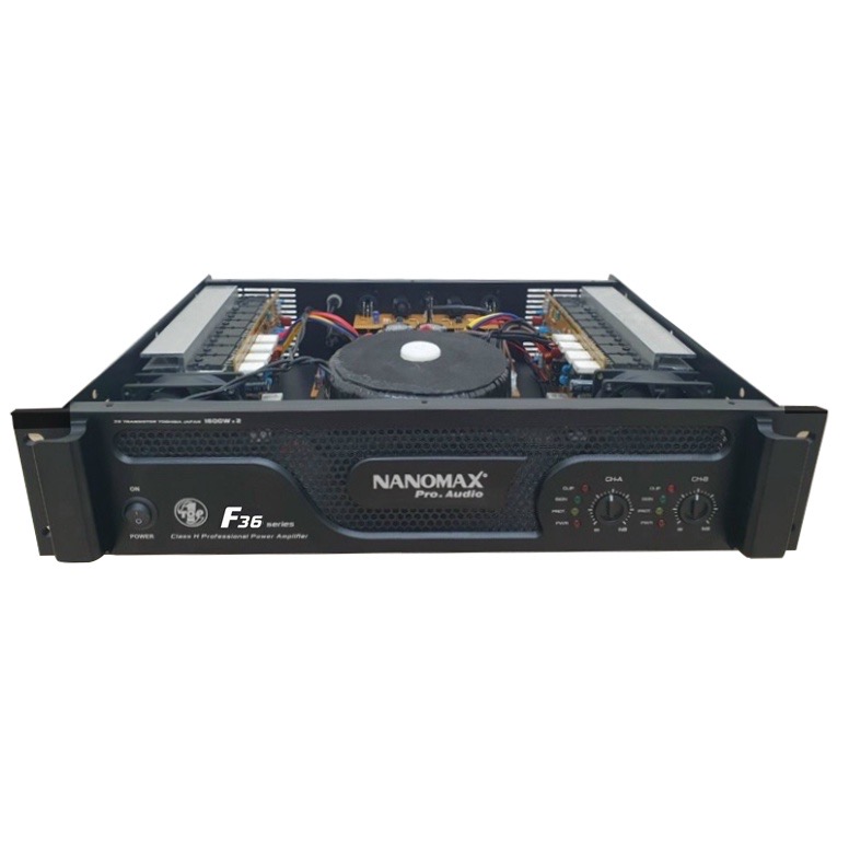 Mua tại TiktokMain công suất Nanomax F36 Thông số kỹ thuật: Dãy tần hoạt động: 20Hz - 20KHz Mạch công suất: Class H (Chức năng bù nguồn) Sò công suất: 36 sò ToshibaJapan Công suất: 1800W / 2 Channel Điện áp: AC-220V / 50Hz Kích thước (DxRxC): 430 x 300 x 90 mm