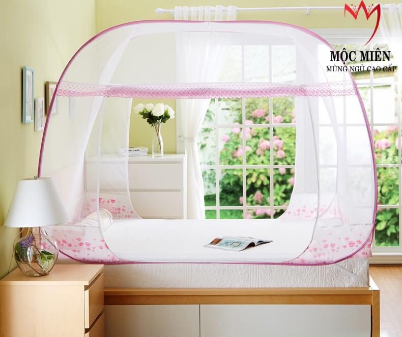MÀN CHỤP , MÙNG CHỤP CAO CẤP MỘC MIÊN ĐỈNH RỘNG : Màn chụp tự bung cao cấp Mộc Miên đỉnh rộng trắng viền hồng loại 1,6m x2m - 3 cửa : Xuất xứ :